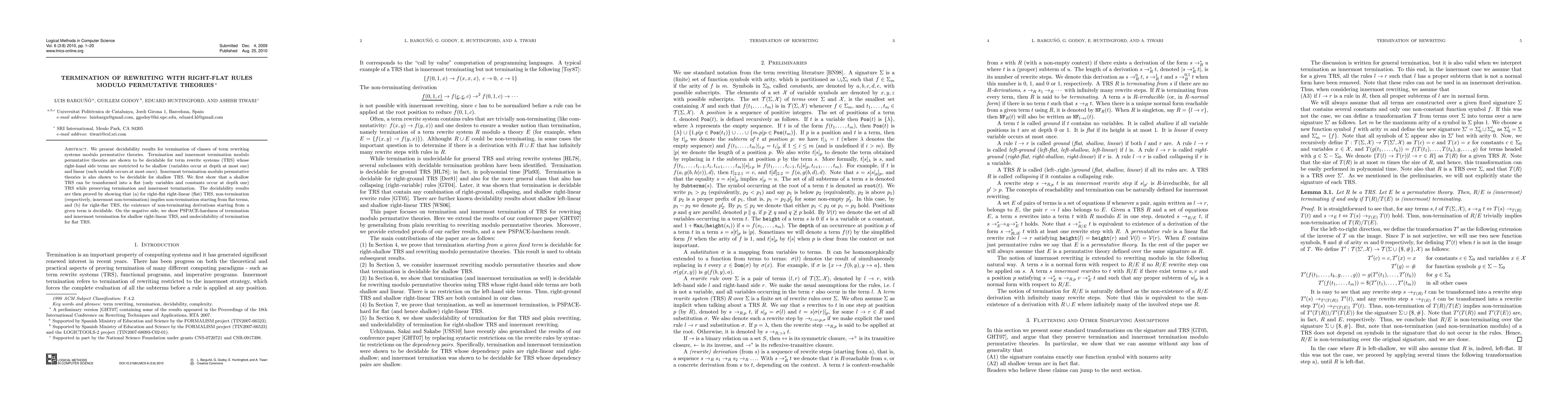 We present decidability results for termination of classes of term rewriting systems modulo permutative theories. Termination and innermost termination modulo permutative theories are shown to be decidable for term rewrite systems (TRS) whose right-hand side terms are restricted to be shallow (variables occur at depth at most one) and linear (each variable occurs at most once). Innermost termination modulo permutative theories is also shown to be decidable for shallow TRS. We first show that a shallow TRS can be transformed into a flat (only variables and constants occur at depth one) TRS while preserving termination and innermost termination. The decidability results are then proved by showing that (a) for right-flat right-linear (flat) TRS, non-termination (respectively, innermost non-termination) implies non-termination starting from flat terms, and (b) for right-flat TRS, the existence of non-terminating derivations starting from a given term is decidable. On the negative side, we show PSPACE-hardness of termination and innermost termination for shallow right-linear TRS, and undecidability of termination for flat TRS.