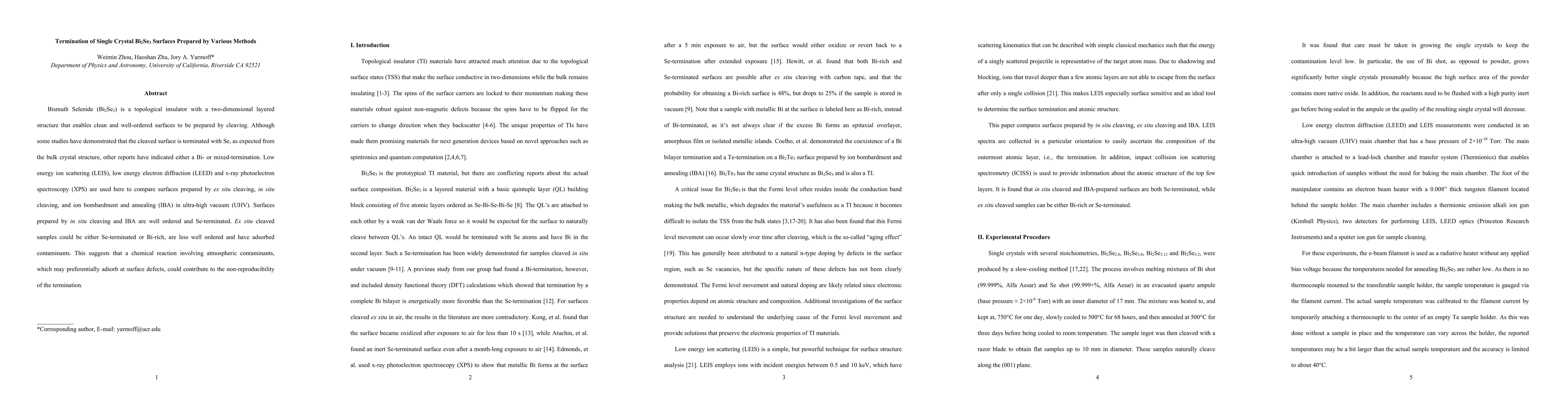 This study investigates the surface termination of Bi2Se3, a topological insulator, using various preparation methods. Techniques like LEIS, LEED, and XPS reveal that in situ cleaving and ion bombardment followed by annealing yield well-ordered Se-terminated surfaces, while ex situ cleaving results in either Se-terminated or Bi-rich, less ordered surfaces with contaminants, suggesting atmospheric reactions at defects.
