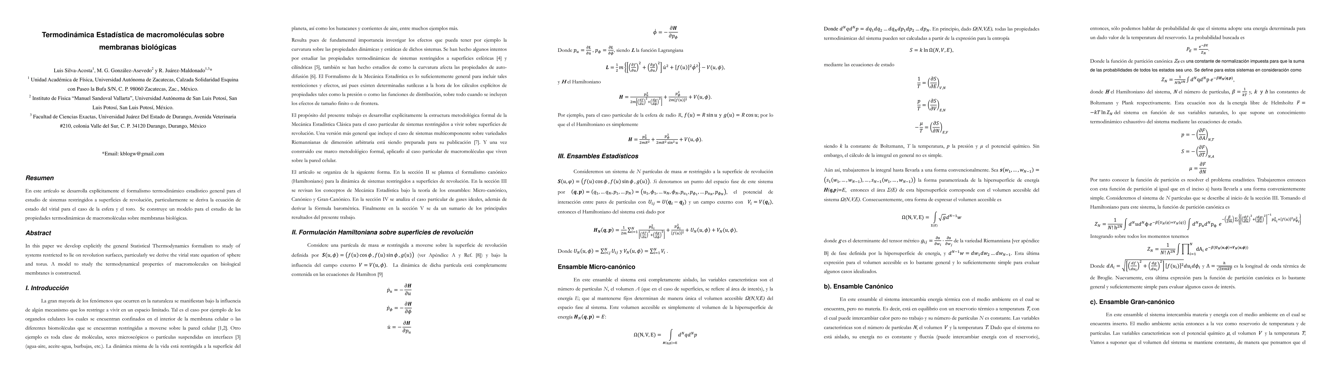 In this paper we develop explicitly the general Statistical Thermodynamics formalism to study of systems restricted to lie on revolution surfaces, particularly we derive the virial state equation of sphere and torus. A model to study the thermodynamical properties of macromolecules on biological membranes is constructed.