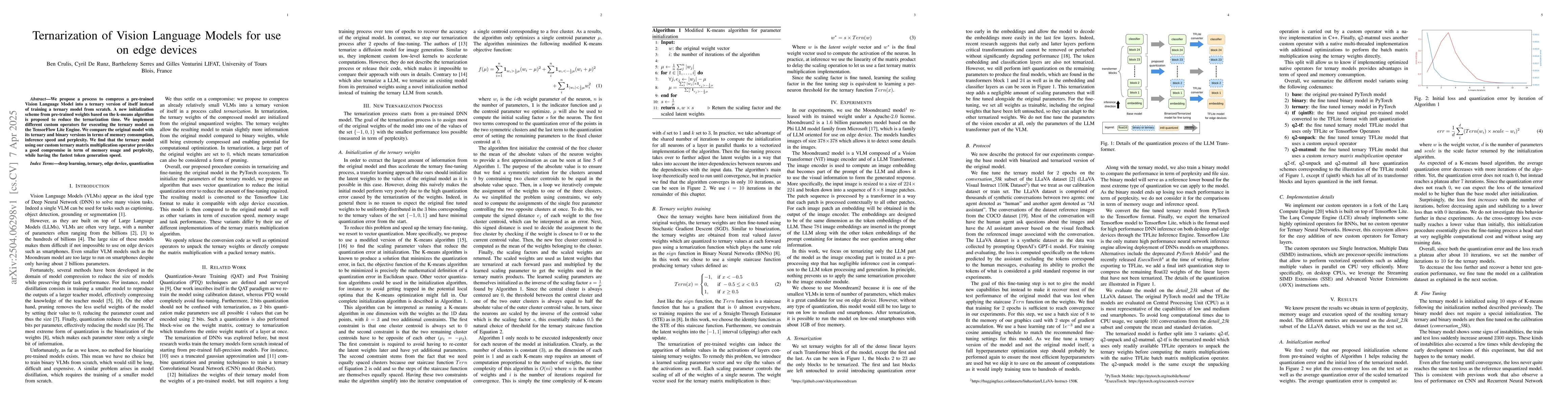 We propose a process to compress a pre-trained Vision Language Model into a ternary version of itself instead of training a ternary model from scratch. A new initialization scheme from pre-trained weights based on the k-means algorithm is proposed to reduce the ternarization time. We implement different custom operators for executing the ternary model on the TensorFlow Lite Engine. We compare the original model with its ternary and binary versions in terms of memory consumption, inference speed and perplexity. We find that the ternary model using our custom ternary matrix multiplication operator provides a good compromise in term of memory usage and perplexity, while having the fastest token generation speed.