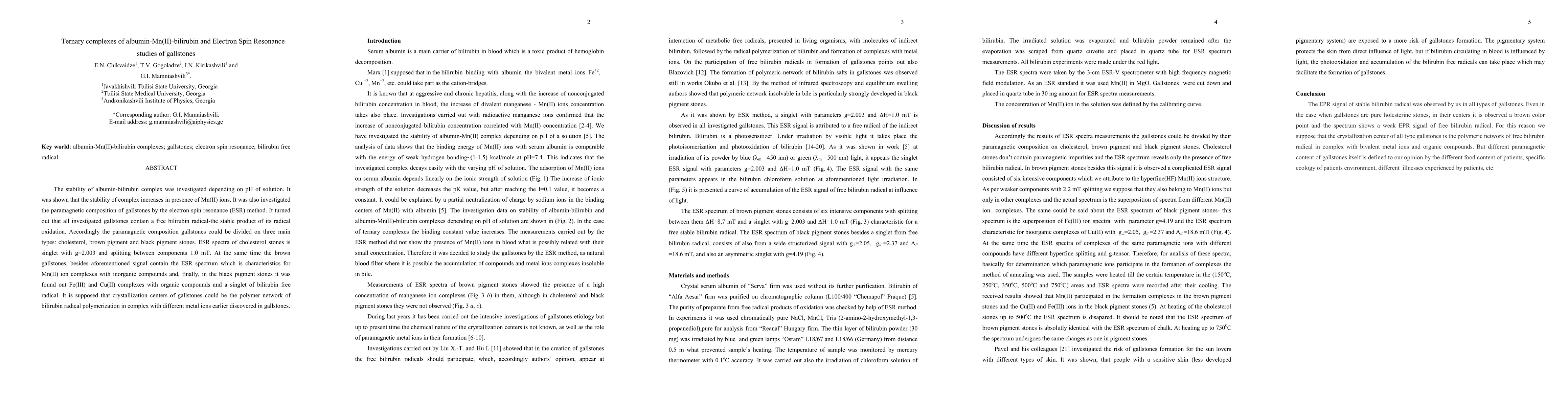 This paper investigates the stability of albumin-bilirubin complexes in varying pH conditions, showing increased stability with Mn(II) ions. It also uses electron spin resonance to analyze gallstones, revealing that all contain a free bilirubin radical, classifying them into cholesterol, brown pigment, and black pigment types based on their paramagnetic compositions.