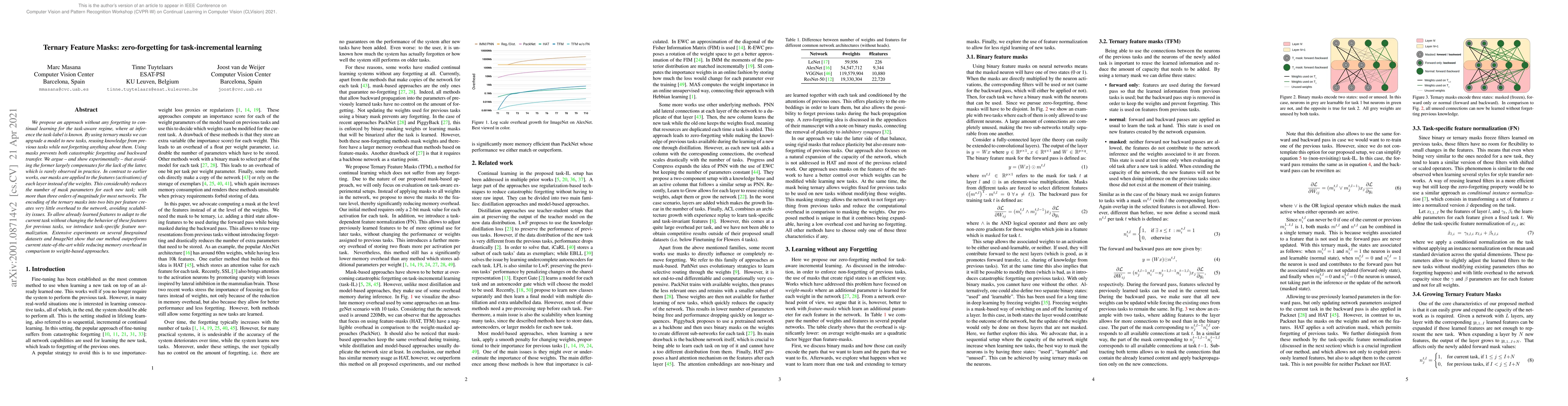 Researchers propose a method to learn new tasks without forgetting previous ones, using ternary feature masks that reduce memory overhead compared to traditional weight-based approaches.