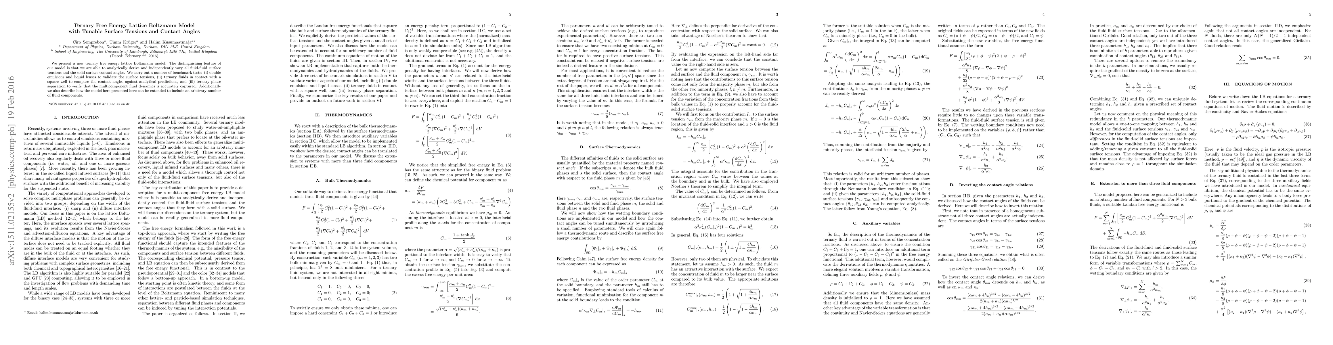 We present a new ternary free energy lattice Boltzmann model. The distinguishing feature of our model is that we are able to analytically derive and independently vary all fluid-fluid surface tensions and the solid surface contact angles. We carry out a number of benchmark tests: (i) double emulsions and liquid lenses to validate the surface tensions, (ii) ternary fluids in contact with a square well to compare the contact angles against analytical predictions, and (iii) ternary phase separation to verify that the multicomponent fluid dynamics is accurately captured. Additionally we also describe how the model here presented here can be extended to include an arbitrary number of fluid components.