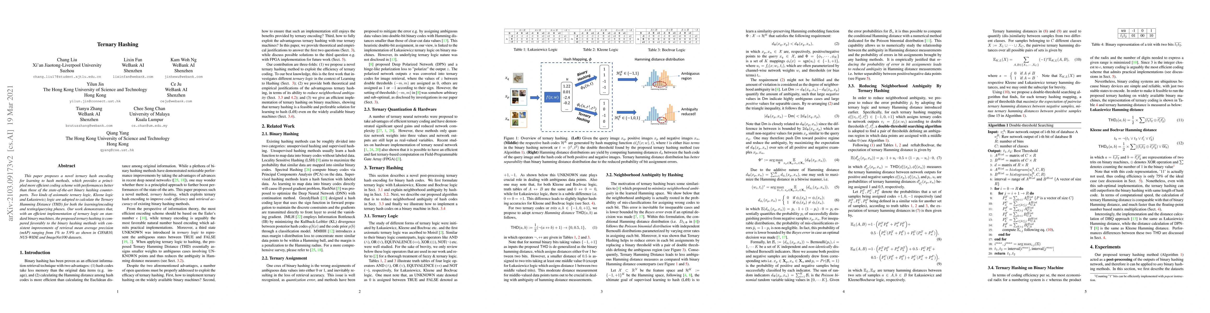 This paper proposes a novel ternary hash encoding for learning to hash methods, which provides a principled more efficient coding scheme with performances better than those of the state-of-the-art binary hashing counterparts. Two kinds of axiomatic ternary logic, Kleene logic and {\L}ukasiewicz logic are adopted to calculate the Ternary Hamming Distance (THD) for both the learning/encoding and testing/querying phases. Our work demonstrates that, with an efficient implementation of ternary logic on standard binary machines, the proposed ternary hashing is compared favorably to the binary hashing methods with consistent improvements of retrieval mean average precision (mAP) ranging from 1\% to 5.9\% as shown in CIFAR10, NUS-WIDE and ImageNet100 datasets.