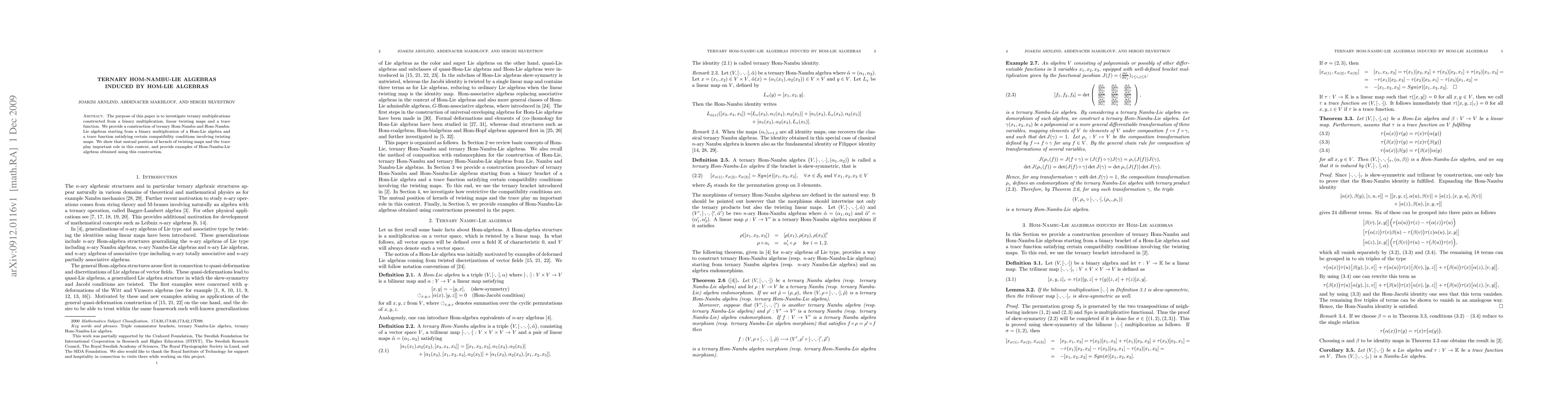 The purpose of this paper is to investigate ternary multiplications constructed from a binary multiplication, linear twisting maps and a trace function. We provide a construction of ternary Hom-Nambu and Hom-Nambu-Lie algebras starting from a binary multiplication of a Hom-Lie algebra and a trace function satisfying certain compatibility conditions involving twisting maps. We show that mutual position of kernels of twisting maps and the trace play important role in this context, and provide examples of Hom-Nambu-Lie algebras obtained using this construction.