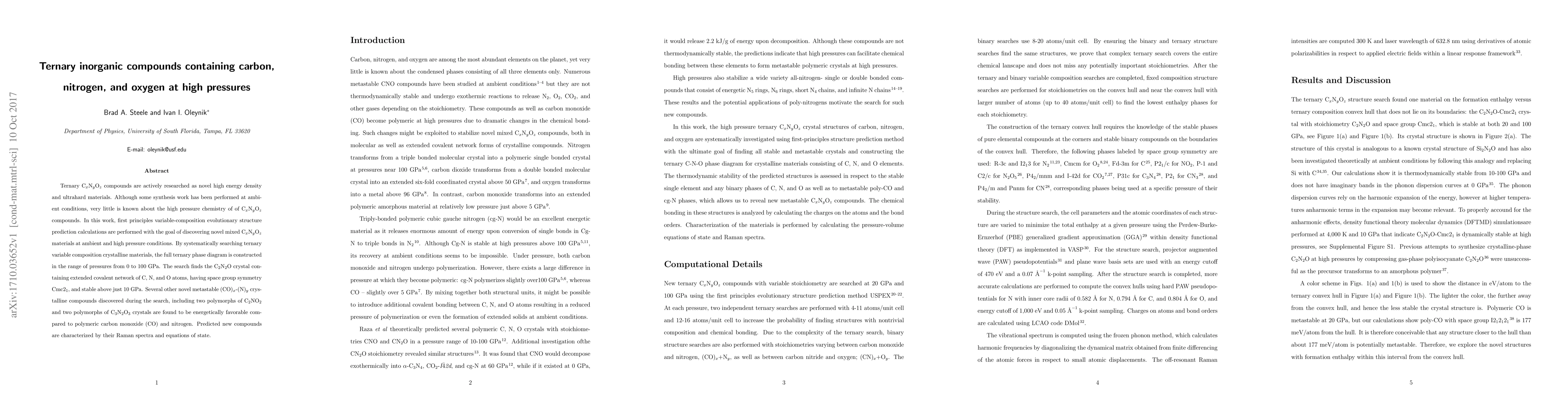 Ternary C_{x}N_{y}O_{z} compounds are actively researched as novel high energy density and ultrahard materials. Although some synthesis work has been performed at ambient conditions, very little is known about the high pressure chemistry of of C_{x}N_{y}O_{z} compounds. In this work, first principles variable-composition evolutionary structure prediction calculations are performed with the goal of discovering novel mixed C_{x}N_{y}O_{z} materials at ambient and high pressure conditions. By systematically searching ternary variable composition crystalline materials, the full ternary phase diagram is constructed in the range of pressures from 0 to 100 GPa. The search finds the C_{2}N_{2}O crystal containing extended covalent network of C, N, and O atoms, having space group symmetry Cmc2_{1}, and stable above just 10 GPa. Several other novel metastable (CO)_{x}-(N)_{y} crystalline compounds discovered during the search, including two polymorphs of C_{2}NO_{2} and two polymorphs of C_{3}N_{2}O_{3} crystals are found to be energetically favorable compared to polymeric carbon monoxide (CO) and nitrogen. Predicted new compounds are characterized by their Raman spectra and equations of state.