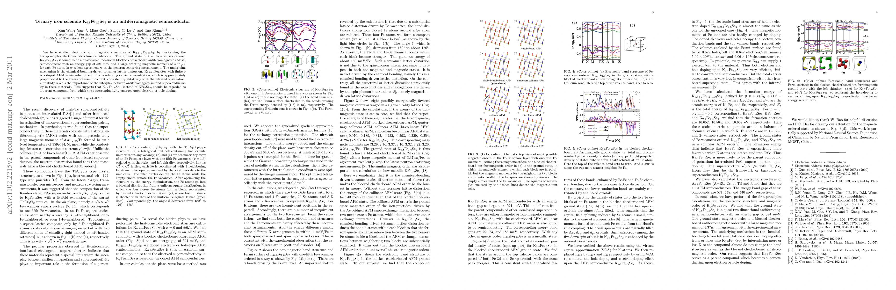The paper presents detailed first-principles calculations elucidating the electronic and magnetic structures of K0.8Fe1.6Se2, revealing its antiferromagnetic semiconducting nature.