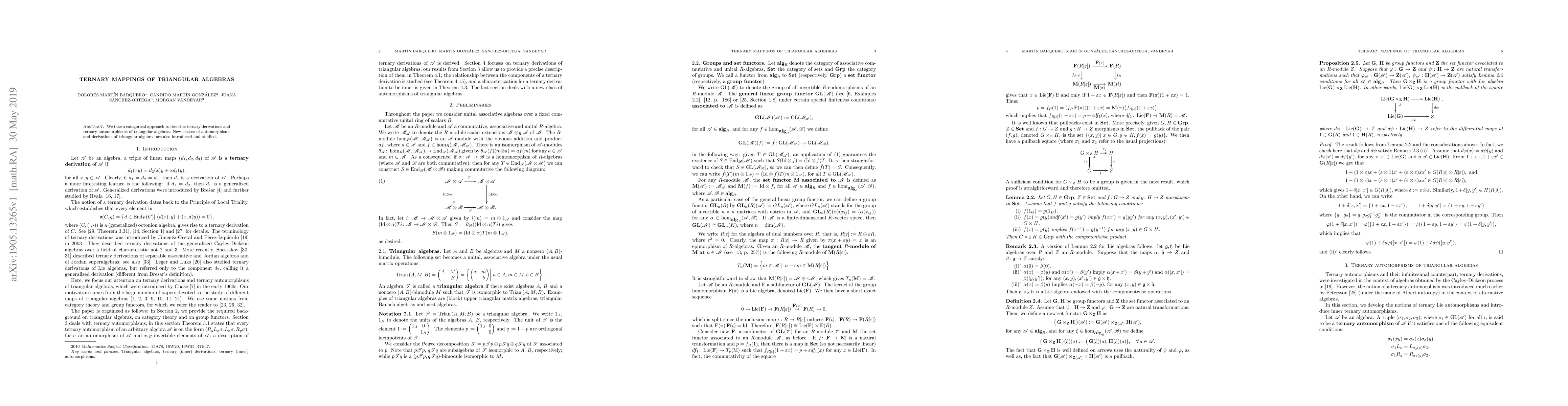 Summary: This paper uses a categorical framework to explore ternary derivations and automorphisms in triangular algebras, introducing and analyzing new classes of these algebraic structures.