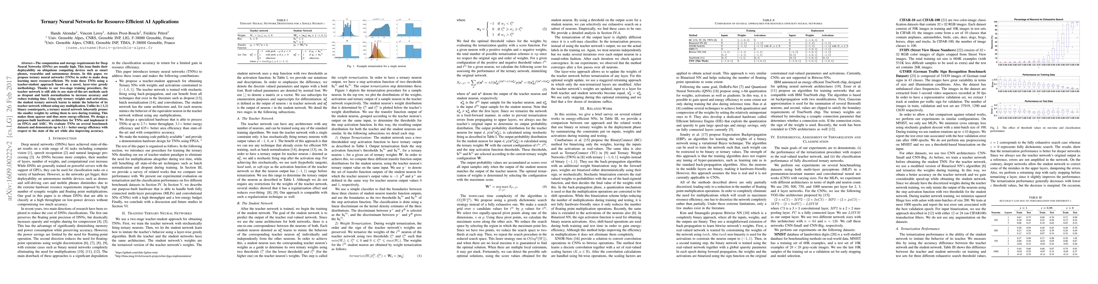The computation and storage requirements for Deep Neural Networks (DNNs) are usually high. This issue limits their deployability on ubiquitous computing devices such as smart phones, wearables and autonomous drones. In this paper, we propose ternary neural networks (TNNs) in order to make deep learning more resource-efficient. We train these TNNs using a teacher-student approach based on a novel, layer-wise greedy methodology. Thanks to our two-stage training procedure, the teacher network is still able to use state-of-the-art methods such as dropout and batch normalization to increase accuracy and reduce training time. Using only ternary weights and activations, the student ternary network learns to mimic the behavior of its teacher network without using any multiplication. Unlike its -1,1 binary counterparts, a ternary neural network inherently prunes the smaller weights by setting them to zero during training. This makes them sparser and thus more energy-efficient. We design a purpose-built hardware architecture for TNNs and implement it on FPGA and ASIC. We evaluate TNNs on several benchmark datasets and demonstrate up to 3.1x better energy efficiency with respect to the state of the art while also improving accuracy.
