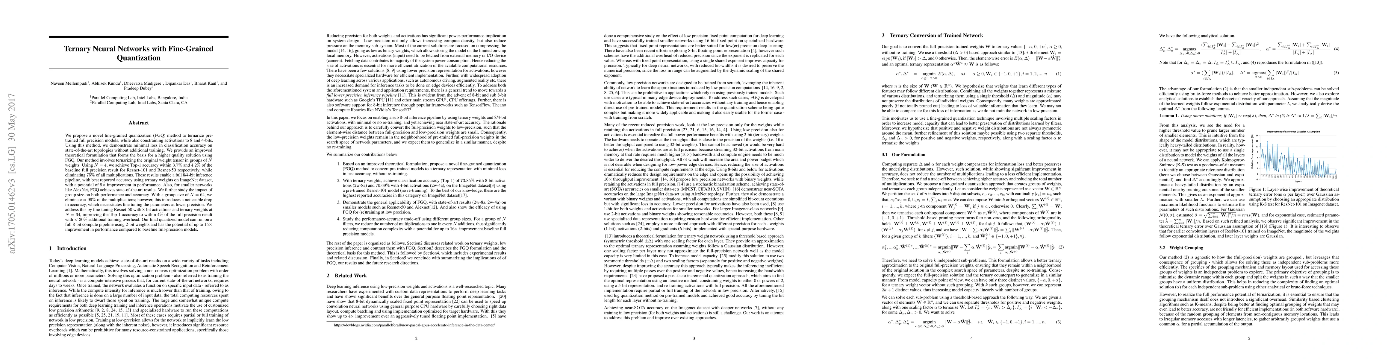 We propose a novel fine-grained quantization (FGQ) method to ternarize pre-trained full precision models, while also constraining activations to 8 and 4-bits. Using this method, we demonstrate a minimal loss in classification accuracy on state-of-the-art topologies without additional training. We provide an improved theoretical formulation that forms the basis for a higher quality solution using FGQ. Our method involves ternarizing the original weight tensor in groups of $N$ weights. Using $N=4$, we achieve Top-1 accuracy within $3.7\%$ and $4.2\%$ of the baseline full precision result for Resnet-101 and Resnet-50 respectively, while eliminating $75\%$ of all multiplications. These results enable a full 8/4-bit inference pipeline, with best-reported accuracy using ternary weights on ImageNet dataset, with a potential of $9\times$ improvement in performance. Also, for smaller networks like AlexNet, FGQ achieves state-of-the-art results. We further study the impact of group size on both performance and accuracy. With a group size of $N=64$, we eliminate $\approx99\%$ of the multiplications; however, this introduces a noticeable drop in accuracy, which necessitates fine tuning the parameters at lower precision. We address this by fine-tuning Resnet-50 with 8-bit activations and ternary weights at $N=64$, improving the Top-1 accuracy to within $4\%$ of the full precision result with $<30\%$ additional training overhead. Our final quantized model can run on a full 8-bit compute pipeline using 2-bit weights and has the potential of up to $15\times$ improvement in performance compared to baseline full-precision models.