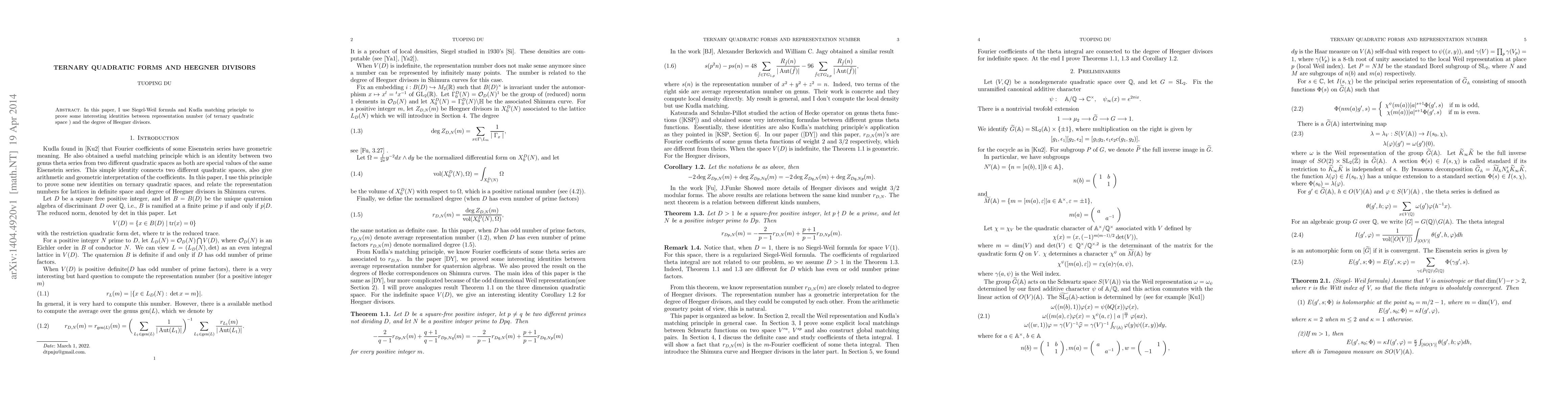 This paper establishes novel identities linking representation numbers of ternary quadratic forms to the degree of Heegner divisors, utilizing the Siegel-Weil formula and Kudla matching principle. The results provide deeper insights into the interplay between algebraic number theory and geometry.