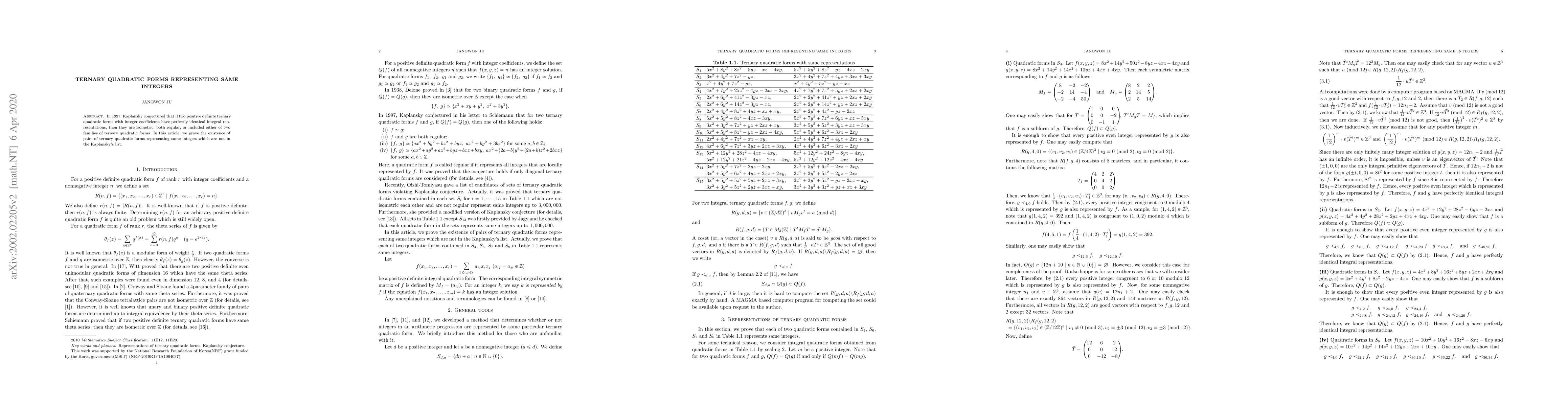 This paper disproves Kaplansky's conjecture by demonstrating pairs of positive definite ternary quadratic forms that represent the same integers but are not isometric or included in the specified families of forms. The findings challenge the notion that identical integer representations imply equivalence within the conjectured categories.