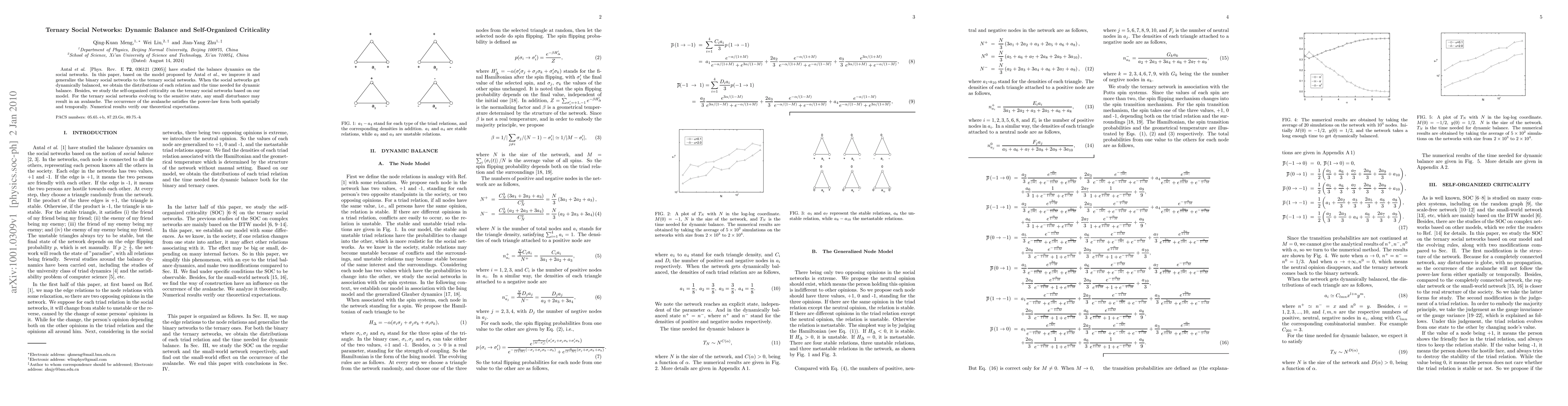 This paper improves and generalizes a model of balance dynamics in social networks from binary to ternary relations, studying the distributions of each relation and the time to dynamic balance. It also investigates self-organized criticality, finding that small disturbances can trigger power-law distributed avalanches in the ternary networks.