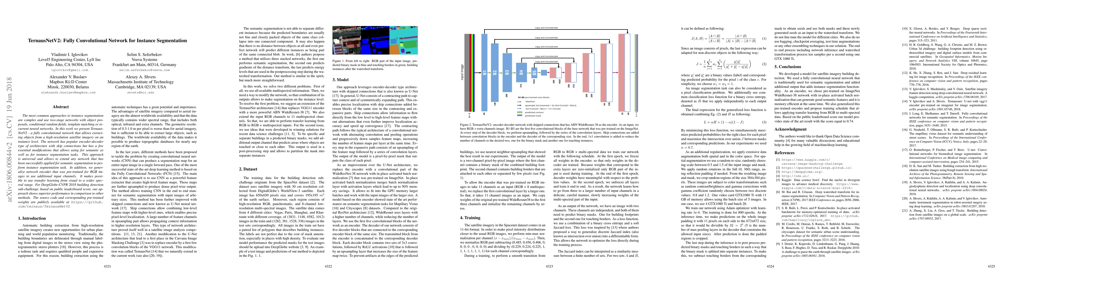 TernausNetV2 is a fully convolutional network that simplifies instance segmentation through a modified encoder-decoder architecture with skip connections, achieving superior performance in high-resolution satellite imagery tasks compared to traditional methods. The network extends to both semantic and instance segmentation, and is publicly available with pre-trained weights.