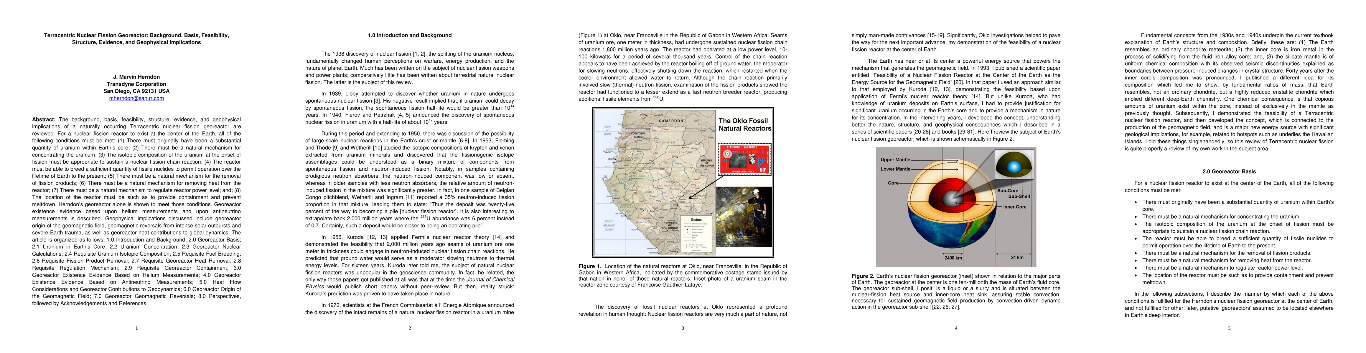 This paper reviews the feasibility and evidence for a naturally occurring Terracentric nuclear fission georeactor, proposing that such a reactor could exist at Earth's core, meeting specific conditions including uranium concentration and heat removal. Evidence includes helium and antineutrino measurements, with geophysical implications suggesting the georeactor's role in geomagnetic field generation and reversals.