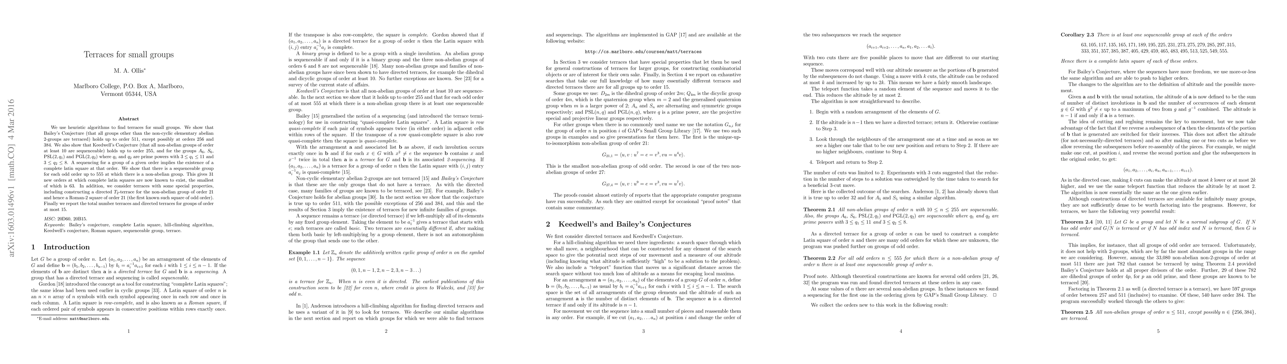 We use heuristic algorithms to find terraces for small groups. We show that Bailey's Conjecture (that all groups other than the non-cyclic elementary abelian 2-groups are terraced) holds up to order 511, except possibly at orders 256 and 384. We also show that Keedwell's Conjecture (that all non-abelian groups of order at least 10 are sequenceable) holds up to order 255, and for the groups $A_6$, $S_6$, $PSL(2,q_1)$ and $PGL(2, q_2)$ where $q_1$ and $q_2$ are prime powers with $3 \leq q_1 \leq 11$ and $3 \leq q_2 \leq 8$. A sequencing for a group of a given order implies the existence of a complete latin square at that order. We show that there is a sequenceable group for each odd order up to 555 at which there is a non-abelian group. This gives 31 new orders at which complete latin squares are now known to exist, the smallest of which is 63. In addition, we consider terraces with some special properties, including constructing a directed $T_2$-terrace for the non-abelian group of order 21 and hence a Roman-2 square of order 21 (the first known such square of odd order). Finally we report the total number terraces and directed terraces for groups of order at most 15.