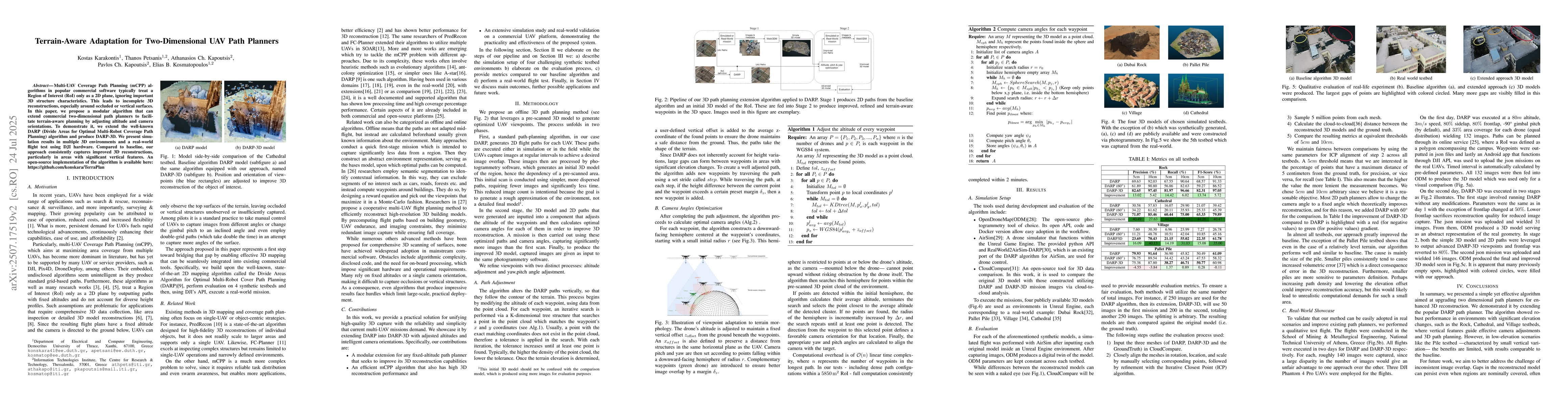 Multi-UAV Coverage Path Planning (mCPP) algorithms in popular commercial software typically treat a Region of Interest (RoI) only as a 2D plane, ignoring important3D structure characteristics. This leads to incomplete 3Dreconstructions, especially around occluded or vertical surfaces. In this paper, we propose a modular algorithm that can extend commercial two-dimensional path planners to facilitate terrain-aware planning by adjusting altitude and camera orientations. To demonstrate it, we extend the well-known DARP (Divide Areas for Optimal Multi-Robot Coverage Path Planning) algorithm and produce DARP-3D. We present simulation results in multiple 3D environments and a real-world flight test using DJI hardware. Compared to baseline, our approach consistently captures improved 3D reconstructions, particularly in areas with significant vertical features. An open-source implementation of the algorithm is available here:https://github.com/konskara/TerraPlan