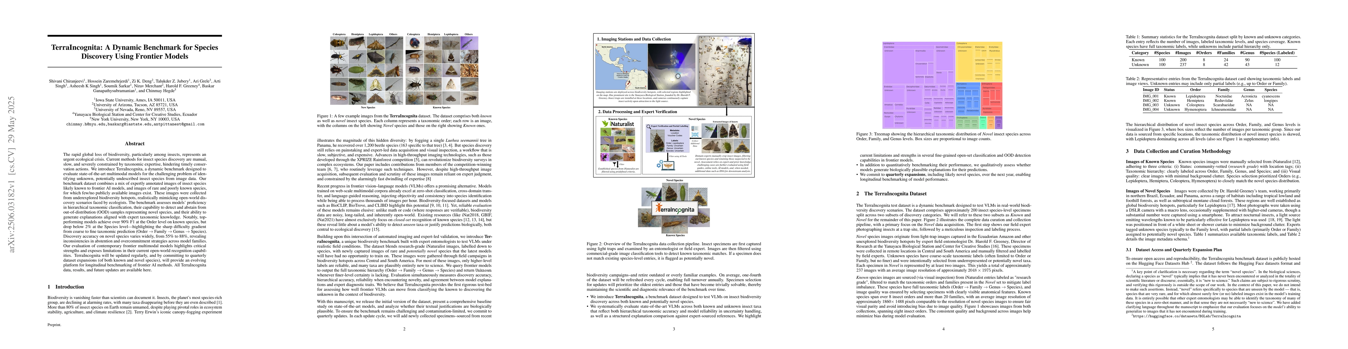 TerraIncognita provides a dynamic, multimodal benchmark dataset and evaluation framework for species discovery using frontier AI models, focusing on hierarchical taxonomic classification, OOD sample detection, and explanation generation.