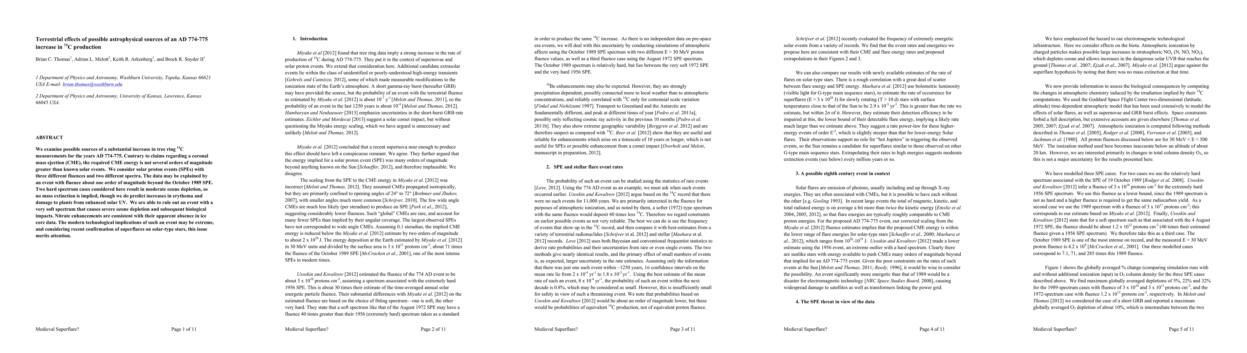 We examine possible sources of a substantial increase in tree ring 14C measurements for the years AD 774-775. Contrary to claims regarding a coronal mass ejection (CME), the required CME energy is not several orders of magnitude greater than known solar events. We consider solar proton events (SPEs) with three different fluences and two different spectra. The data may be explained by an event with fluence about one order of magnitude beyond the October 1989 SPE. Two hard spectrum cases considered here result in moderate ozone depletion, so no mass extinction is implied, though we do predict increases in erythema and damage to plants from enhanced solar UV. We are able to rule out an event with a very soft spectrum that causes severe ozone depletion and subsequent biological impacts. Nitrate enhancements are consistent with their apparent absence in ice core data. The modern technological implications of such an event may be extreme, and considering recent confirmation of superflares on solar-type stars, this issue merits attention.