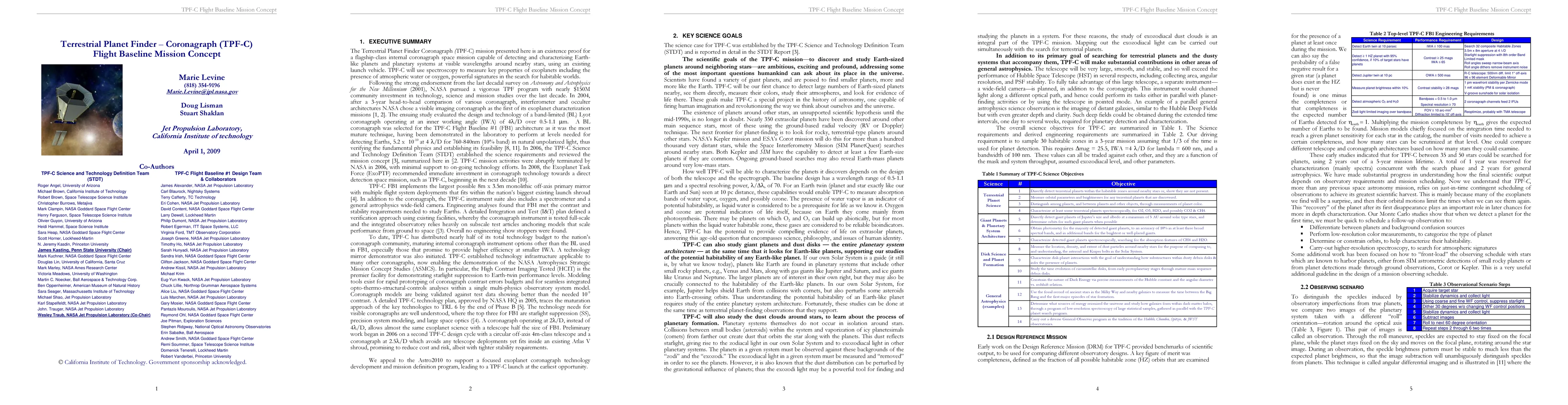 The TPF-C mission aims to demonstrate a flagship-class space mission for detecting and characterizing Earth-like planets around nearby stars using spectroscopy to identify atmospheric water or oxygen. This mission serves as an existence proof for an internal coronagraph launched on an existing vehicle.