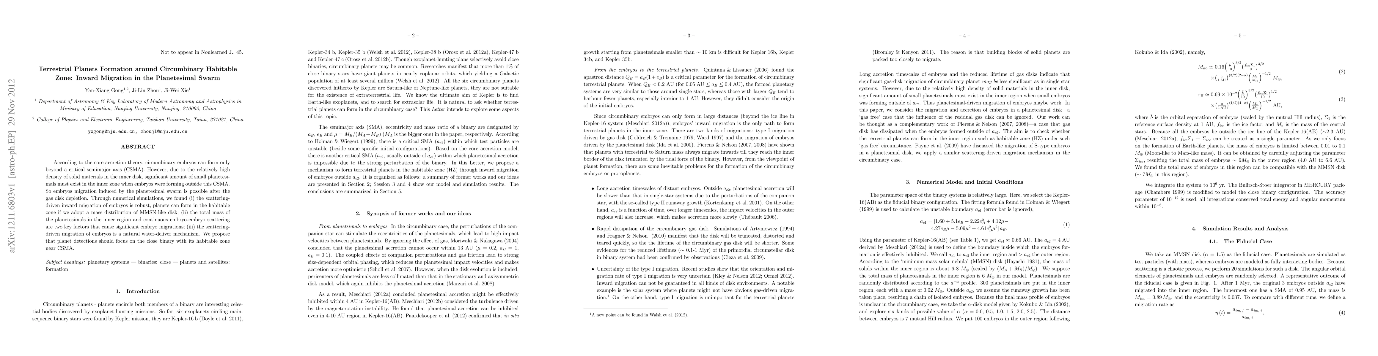 This paper investigates the formation of terrestrial planets within the circumbinary habitable zone through inward migration of embryos driven by planetesimal scattering post-gas disk depletion. Numerical simulations show that significant inward migration and planet formation in the habitable zone are possible, emphasizing the role of inner planetesimal mass and embryo-embryo scattering.
