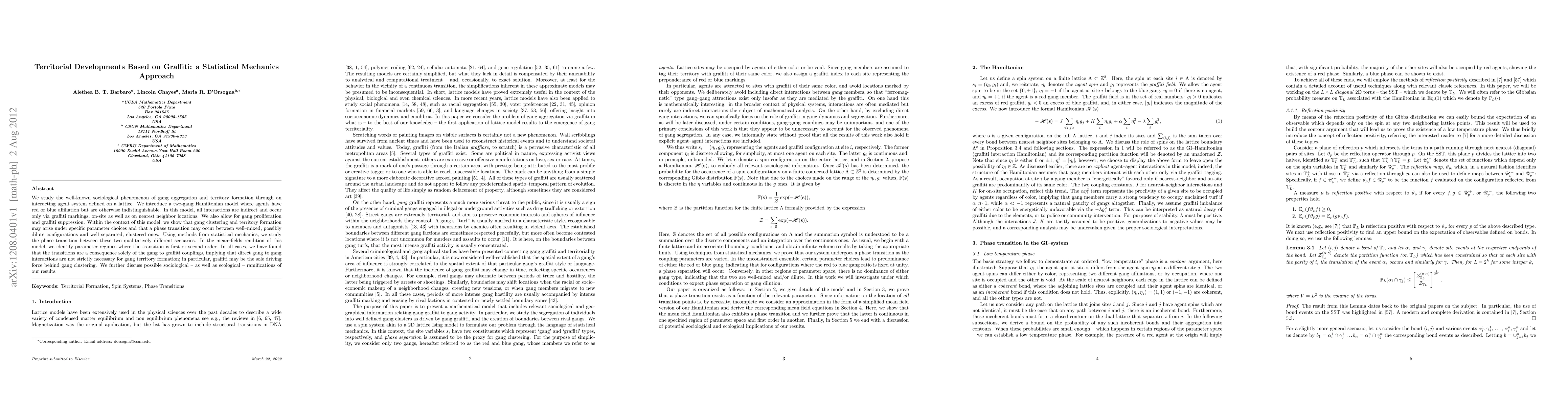 This paper uses a statistical mechanics approach to model gang aggregation and territory formation through graffiti interactions on a lattice. It finds that gang clustering and territory formation can emerge due to graffiti couplings alone, without direct gang-to-gang interactions, and identifies parameter regimes for first or second-order phase transitions in this process.
