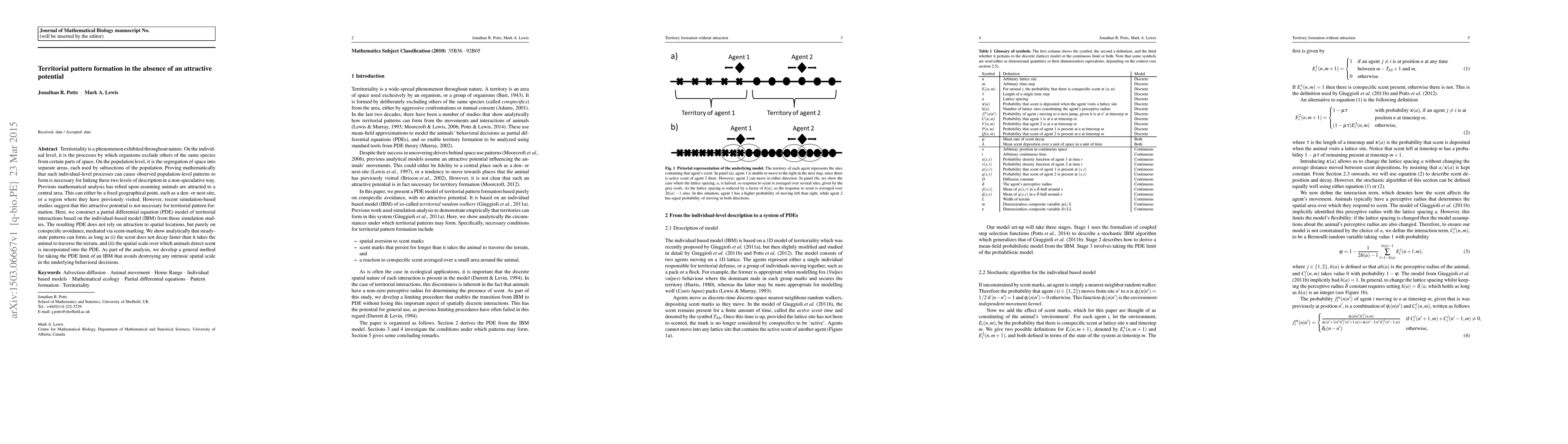 Territoriality is a phenomenon exhibited throughout nature. On the individual level, it is the processes by which organisms exclude others of the same species from certain parts of space. On the population level, it is the segregation of space into separate areas, each used by subsections of the population. Proving mathematically that such individual-level processes can cause observed population-level patterns to form is necessary for linking these two levels of description in a non-speculative way. Previous mathematical analysis has relied upon assuming animals are attracted to a central area. This can either be a fixed geographical point, such as a den- or nest-site, or a region where they have previously visited. However, recent simulation-based studies suggest that this attractive potential is not necessary for territorial pattern formation. Here, we construct a partial differential equation (PDE) model of territorial interactions based on the individual-based model (IBM) from those simulation studies. The resulting PDE does not rely on attraction to spatial locations, but purely on conspecific avoidance, mediated via scent-marking. We show analytically that steady-state patterns can form, as long as (i) the scent does not decay faster than it takes the animal to traverse the terrain, and (ii) the spatial scale over which animals detect scent is incorporated into the PDE. As part of the analysis, we develop a general method for taking the PDE limit of an IBM that avoids destroying any intrinsic spatial scale in the underlying behavioral decisions.
