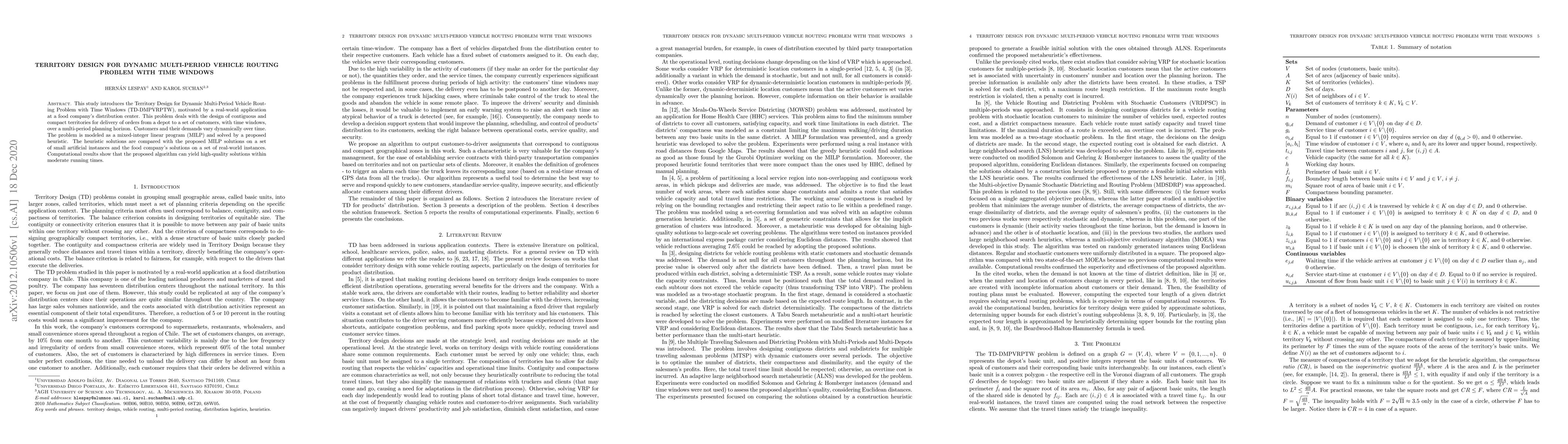 This study proposes a mixed-integer linear programming model and a heuristic for the Territory Design for Dynamic Multi-Period Vehicle Routing Problem with Time Windows (TD-DMPVRPTW), demonstrating its application in a food company's distribution center. The heuristic provides high-quality solutions efficiently compared to MILP on both artificial and real-world instances.