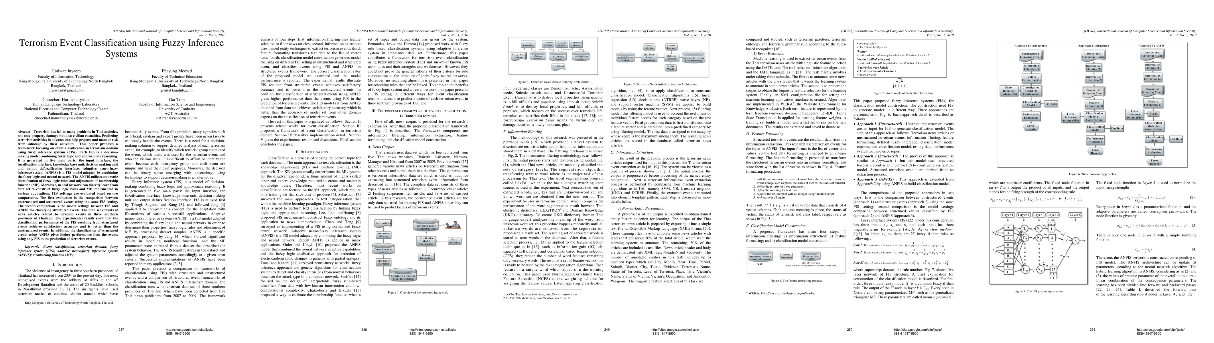 This paper proposes a framework for classifying terrorism events using fuzzy inference systems (FISs), showing that FISs, especially the adaptive neuro-fuzzy inference system (ANFIS), provide better classification accuracy for structured terrorism events compared to unstructured ones. The study uses news articles from Thailand's southern provinces as its dataset.