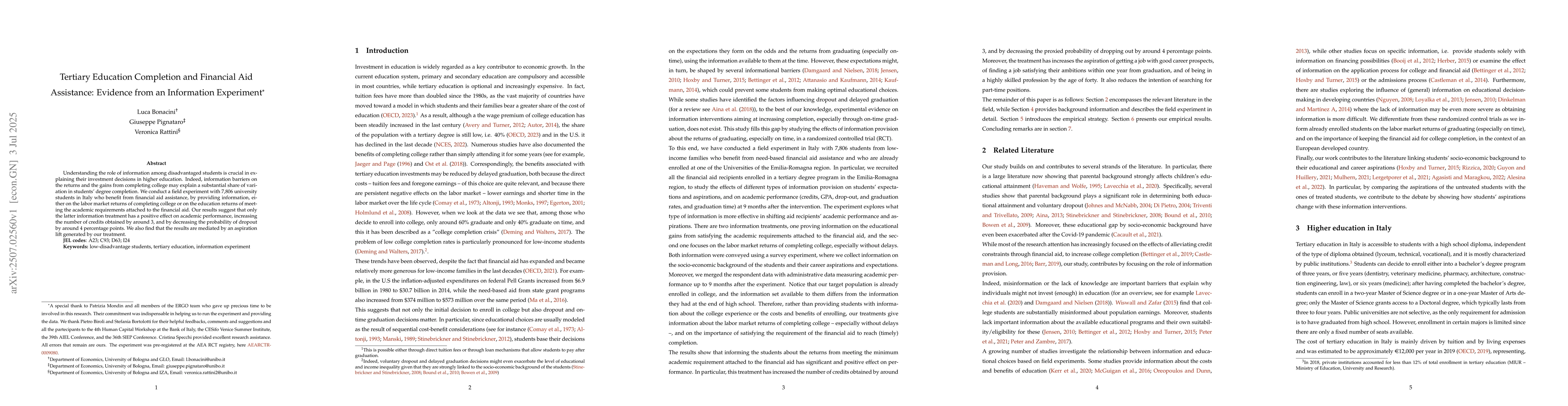 Understanding the role of information among disadvantaged students is crucial in explaining their investment decisions in higher education. Indeed, information barriers on the returns and the gains from completing college may explain a substantial share of variation in students' degree completion. We conduct a field experiment with 7,806 university students in Italy who benefit from financial aid assistance, by providing information, either on the labor market returns of completing college or on the education returns of meeting the academic requirements attached to the financial aid. Our results suggest that only the latter information treatment has a positive effect on academic performance, increasing the number of credits obtained by around 3, and by decreasing the probability of dropout by around 4 percentage points. We also find that the results are mediated by an aspiration lift generated by our treatment.