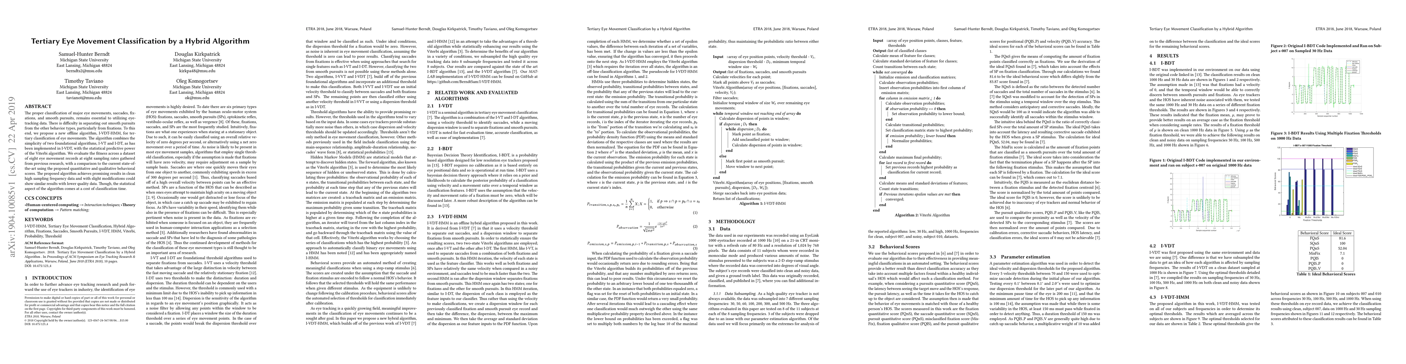 The paper proposes a hybrid algorithm, I-VDT-HMM, for tertiary classification of eye movements, combining I-VT and I-DT for improved accuracy in distinguishing smooth pursuits from fixations. The algorithm shows promising results in high-quality data but requires more time for classification.