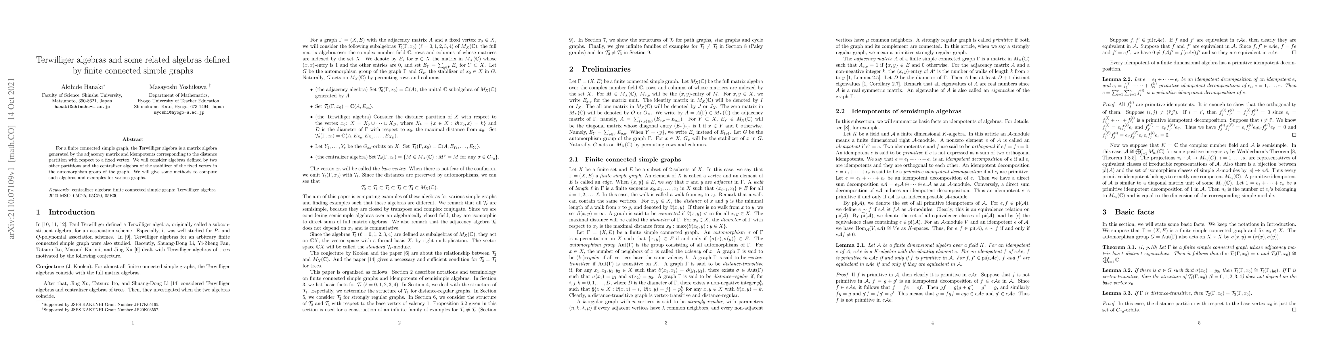 For a finite connected simple graph, the Terwilliger algebra is a matrix algebra generated by the adjacency matrix and idempotents corresponding to the distance partition with respect to a fixed vertex. We will consider algebras defined by two other partitions and the centralizer algebra of the stabilizer of the fixed vertex in the automorphism group of the graph. We will give some methods to compute such algebras and examples for various graphs.