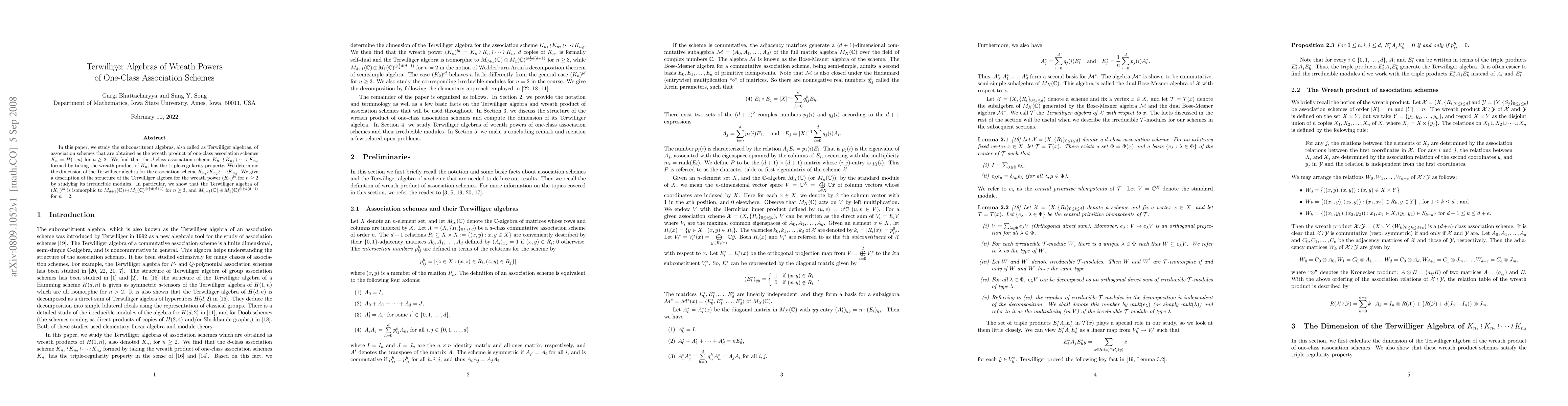 This paper investigates Terwilliger algebras of wreath products of one-class association schemes $K_n=H(1, n)$. It demonstrates that these schemes exhibit triple-regularity and provides the dimension of their corresponding Terwilliger algebras, revealing their structure through irreducible modules.