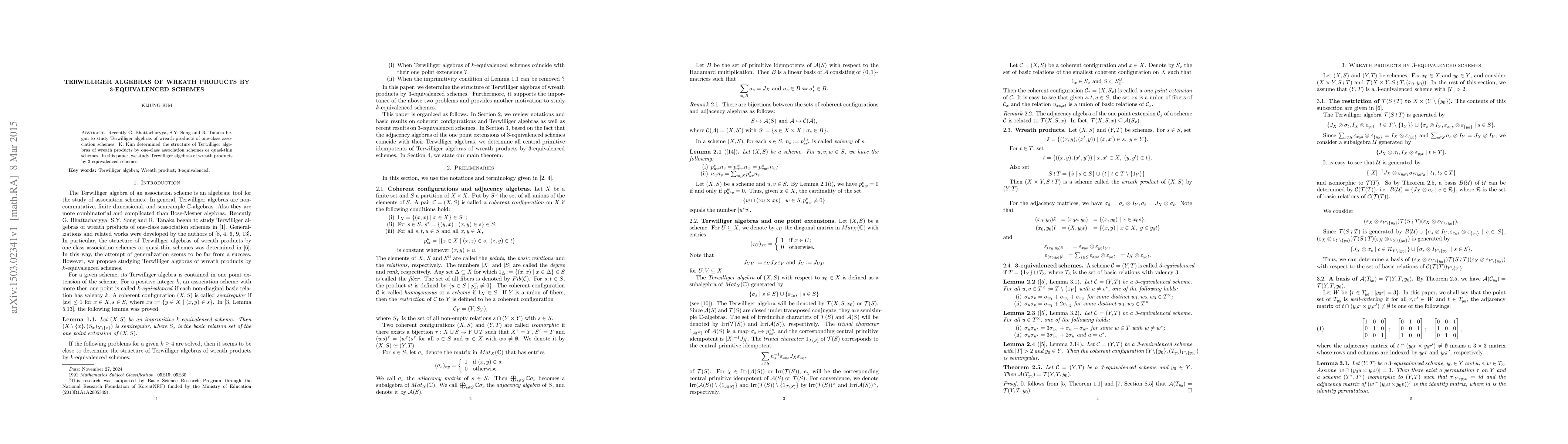 Recently G. Bhattacharyya, S.Y. Song and R. Tanaka began to study Terwilliger algebras of wreath products of one-class association schemes. K. Kim determined the structure of Terwilliger algebras of wreath products by one-class association schemes or quasi-thin schemes. In this paper, we study Terwilliger algebras of wreath products by $3$-equivalenced schemes.