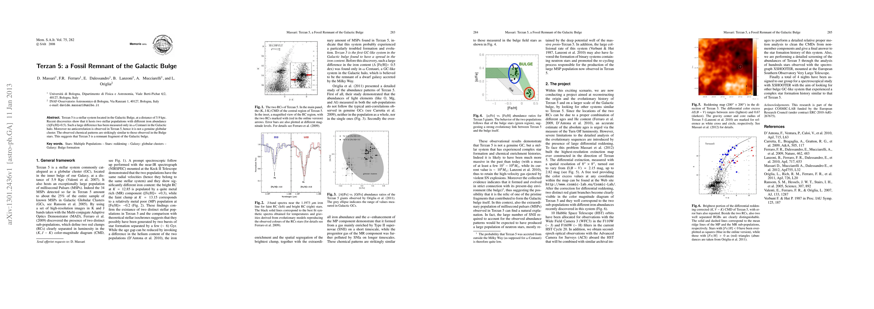 Summary: Terzan 5, located in the Galactic Bulge, exhibits two distinct stellar populations with a significant iron abundance difference, resembling Bulge stars rather than a typical globular cluster, indicating it may be a relic fragment of the Galactic bulge.