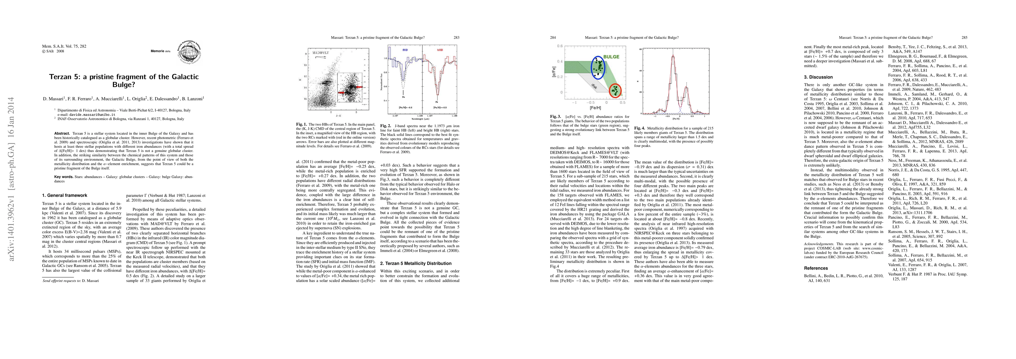 Summary: Terzan 5, previously thought to be a globular cluster, is revealed to host multiple stellar populations with diverse iron abundances, indicating it is not a genuine cluster. Its chemical patterns closely match those of the Galactic Bulge, suggesting it may be a pristine fragment of the Bulge.