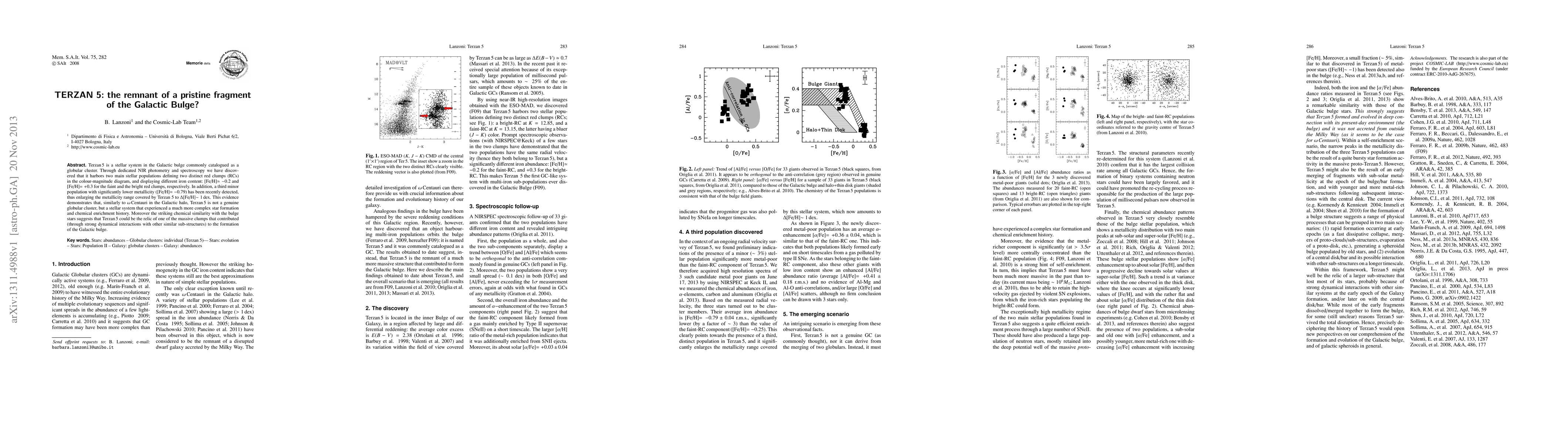 Terzan 5, previously thought to be a globular cluster, is revealed to have two main stellar populations with distinct red clumps and varying iron content, suggesting a complex star formation and chemical enrichment history. Its chemical similarity to bulge stars implies it may be a remnant of a massive clump that contributed to the Galactic bulge's formation.