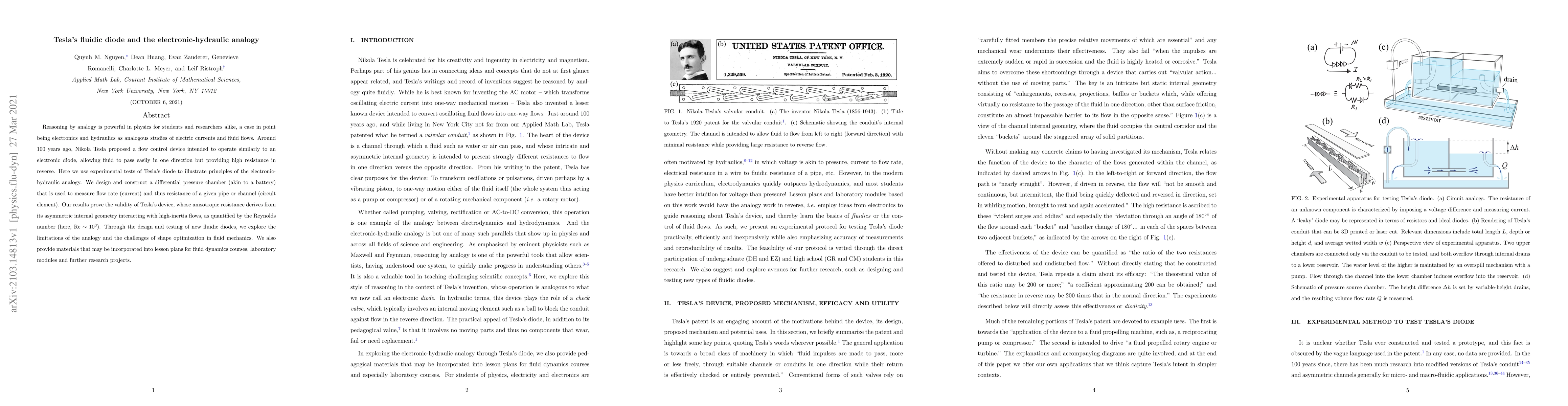 Reasoning by analogy is powerful in physics for students and researchers alike, a case in point being electronics and hydraulics as analogous studies of electric currents and fluid flows. Around 100 years ago, Nikola Tesla proposed a flow control device intended to operate similarly to an electronic diode, allowing fluid to pass easily in one direction but providing high resistance in reverse. Here we use experimental tests of Tesla's diode to illustrate principles of the electronic-hydraulic analogy. We design and construct a differential pressure chamber (akin to a battery) that is used to measure flow rate (current) and thus resistance of a given pipe or channel (circuit element). Our results prove the validity of Tesla's device, whose anisotropic resistance derives from its asymmetric internal geometry interacting with high-inertia flows, as quantified by the Reynolds number (here, Re ~ 1e3). Through the design and testing of new fluidic diodes, we explore the limitations of the analogy and the challenges of shape optimization in fluid mechanics. We also provide materials that may be incorporated into lesson plans for fluid dynamics courses, laboratory modules and further research projects.