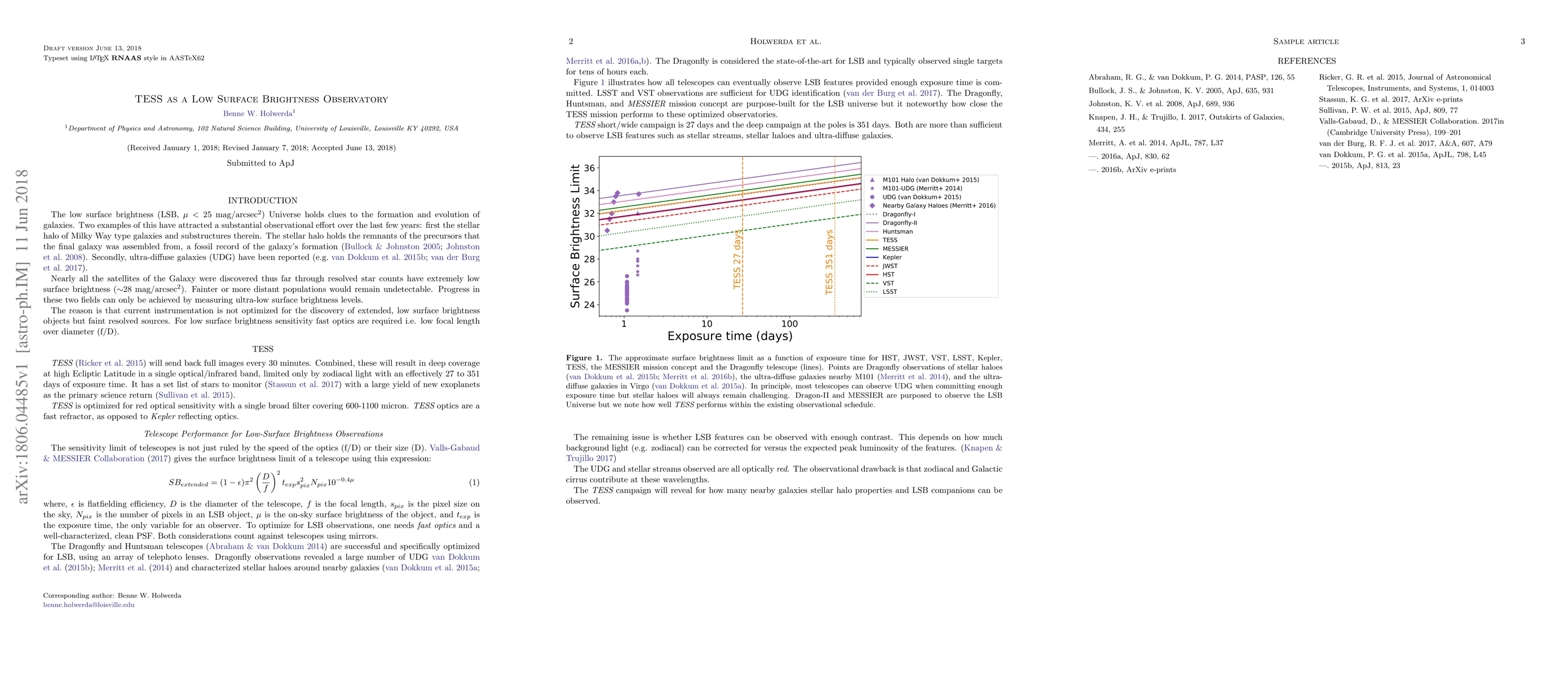 This paper discusses how the TESS satellite, originally designed for exoplanet detection, is well-suited for studying low surface brightness galaxies due to its optical setup and exposure times. It highlights the potential of TESS to model stellar haloes and search for substructures, addressing the "Missing Dwarf Problem" in galaxy formation theories.