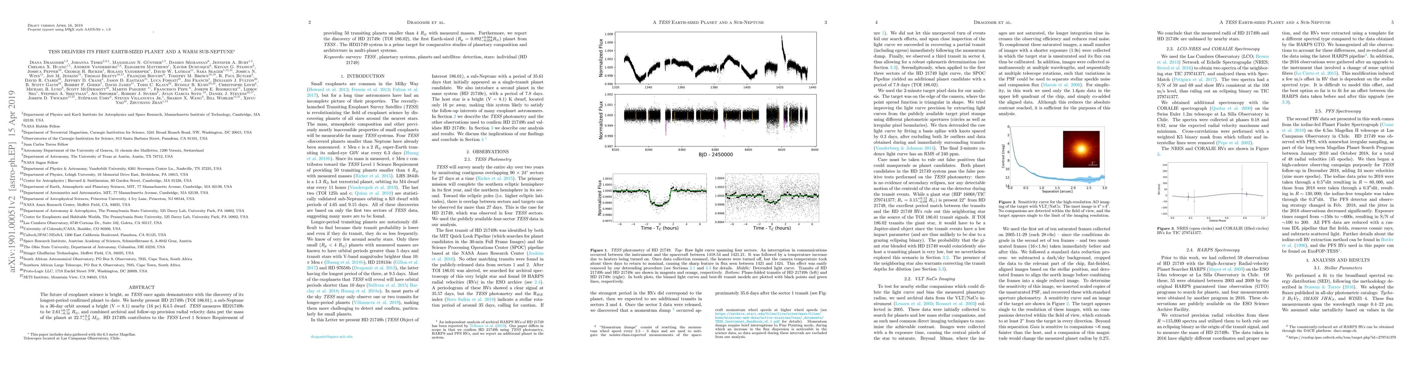 The TESS mission discovered HD 21749b, a sub-Neptune with a 36-day orbit around a nearby K4.5 dwarf, and HD 21749c, the first Earth-sized planet identified by TESS, contributing to the mission's goal of finding smaller transiting planets with measured masses.