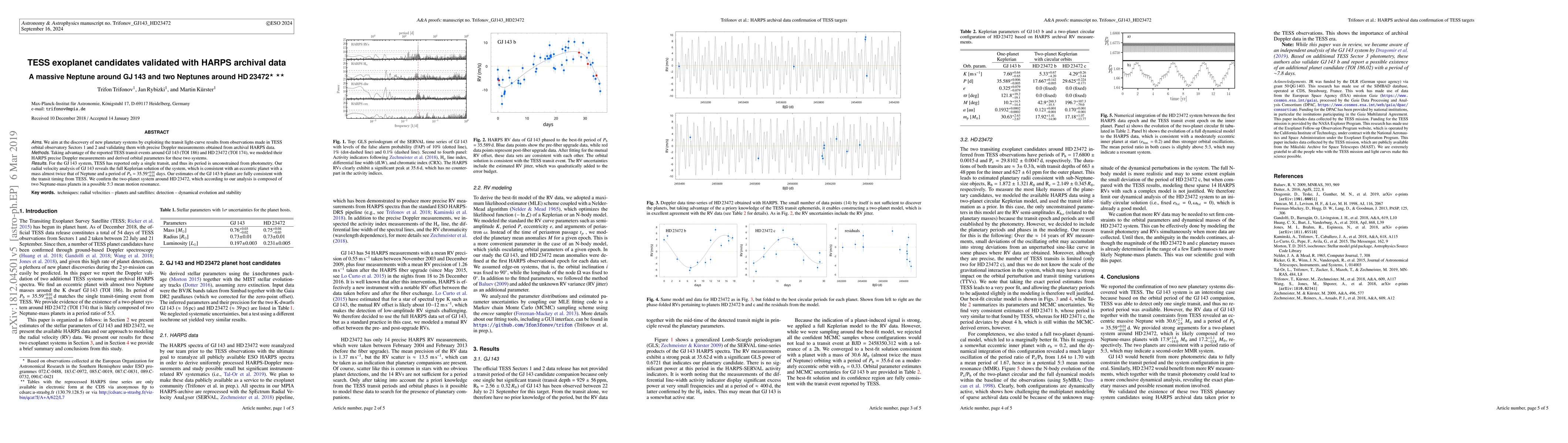 This paper validates TESS exoplanet candidates using HARPS archival data, confirming a massive Neptune around GJ143 and two Neptune-mass planets in a 5:3 mean motion resonance around HD23472. The study derives precise orbital parameters through precise Doppler measurements.
