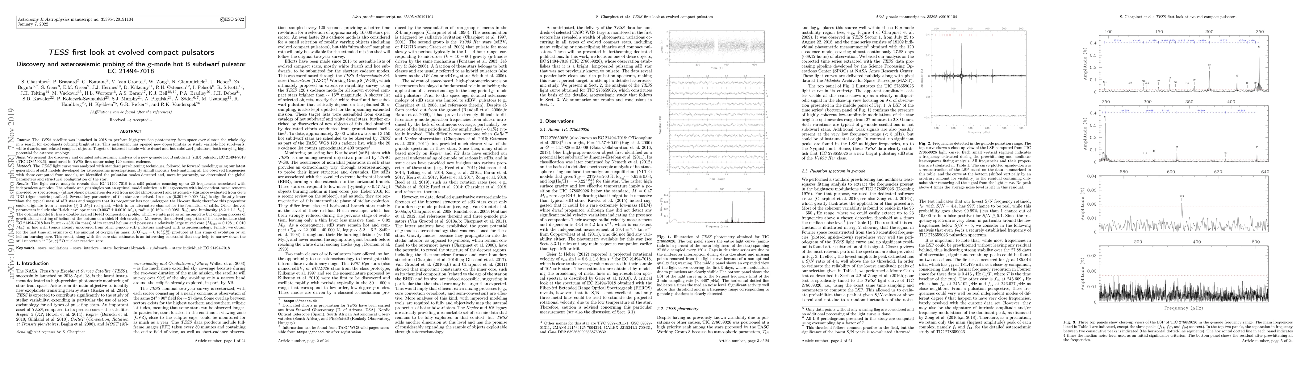 We present the discovery and asteroseismic analysis of a new g-mode hot B subdwarf (sdB) pulsator, EC 21494-7018 (TIC 278659026), monitored in TESS first sector using 120-second cadence. The light curve analysis reveals that EC 21494-7018 is a sdB pulsator counting up to 20 frequencies associated with independent g-modes. The seismic analysis singles out an optimal model solution in full agreement with independent measurements provided by spectroscopy (atmospheric parameters derived from model atmospheres) and astrometry (distance evaluated from Gaia DR2 trigonometric parallax). Several key parameters of the star are derived. Its mass (0.391 +/- 0.009 Msun) is significantly lower than the typical mass of sdB stars, and suggests that its progenitor has not undergone the He-core flash, and therefore could originate from a massive (>2 Msun) red giant, an alternative channel for the formation of hot B subdwarfs. Other derived parameters include the H-rich envelope mass (0.0037 +/- 0.0010 Msun), radius (0.1694 +/- 0.0081 Rsun), and luminosity (8.2+/-1.1 Lsun). The optimal model fit has a double-layered He+H composition profile, which we interpret as an incomplete but ongoing process of gravitational settling of helium at the bottom of a thick H-rich envelope. Moreover, the derived properties of the core indicate that EC 21494-7018 has burnt ~43% (in mass) of its central helium and possesses a relatively large mixed core (Mcore = 0.198 +/- 0.010 Msun), in line with trends already uncovered from other g-mode sdB pulsators analysed with asteroseismology. Finally, we obtain for the first time an estimate of the amount of oxygen (in mass; X(O)core = 0.16 -0.05 +0.13) produced at this stage of evolution by an helium-burning core. This result, along with the core-size estimate, is an interesting constraint that may help to narrow down the still uncertain C12(alpha,gamma)O16 nuclear reaction rate.