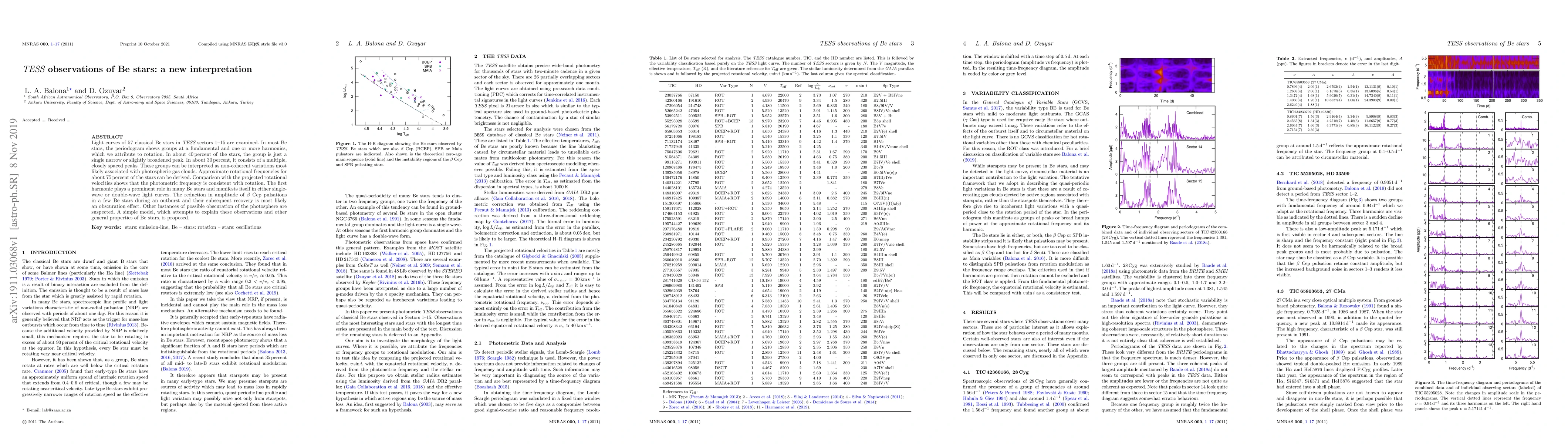 Light curves of 57 classical Be stars in TESS sectors 1 - 15 are examined. In most Be stars, the periodogram shows groups at a fundamental and one or more harmonics, which we attribute to rotation. In about 40 percent of the stars, the group is just a single narrow or slightly broadened peak. In about 30 percent, it consists of a multiple, closely spaced peaks. These groups can be interpreted as non-coherent variations most likely associated with photospheric gas clouds. Approximate rotational frequencies for about 75 percent of the stars can be derived. Comparison with the projected rotational velocities shows that the photometric frequency is consistent with rotation. The first harmonic plays a prominent role in many Be stars and manifests itself in either single-wave or double-wave light curves. The reduction in amplitude of beta Cep pulsations in a few Be stars during an outburst and their subsequent recovery is most likely an obscuration effect. Other instances of possible obscuration of the photosphere are suspected. A simple model, which attempts to explain these observations and other general properties of Be stars, is proposed.