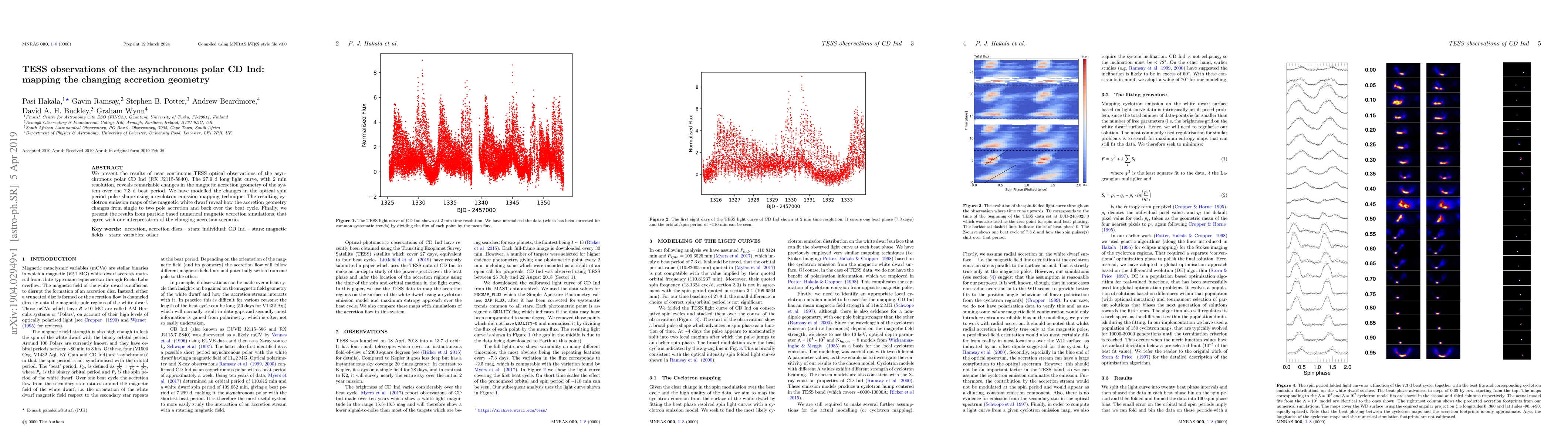 We present the results of near continuous TESS optical observations of the asynchronous polar CD Ind (RX J2115-5840). The 27.9 d long light curve, with 2 min resolution, reveals remarkable changes in the magnetic accretion geometry of the system over the 7.3 d beat period. We have modelled the changes in the optical spin period pulse shape using a cyclotron emission mapping technique. The resulting cyclotron emission maps of the magnetic white dwarf reveal how the accretion geometry changes from single to two pole accretion and back over the beat cycle. Finally, we present the results from particle based numerical magnetic accretion simulations, that agree with our interpretation of the changing accretion scenario.