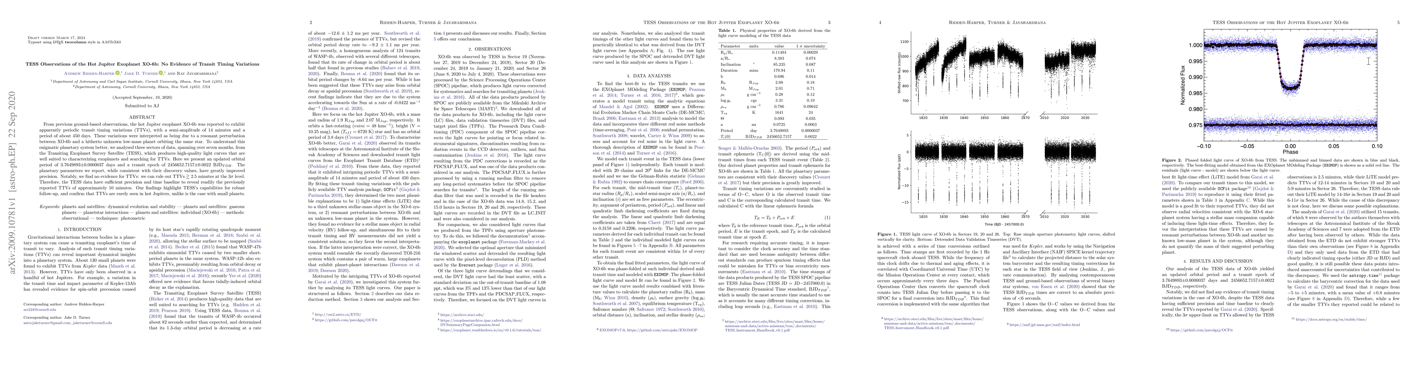 The TESS observations of the hot Jupiter exoplanet XO-6b found no evidence of previously reported transit timing variations (TTVs) despite high precision, suggesting that TTVs are rare in hot Jupiters compared to smaller planets. This highlights TESS's capability for precise follow-up observations.