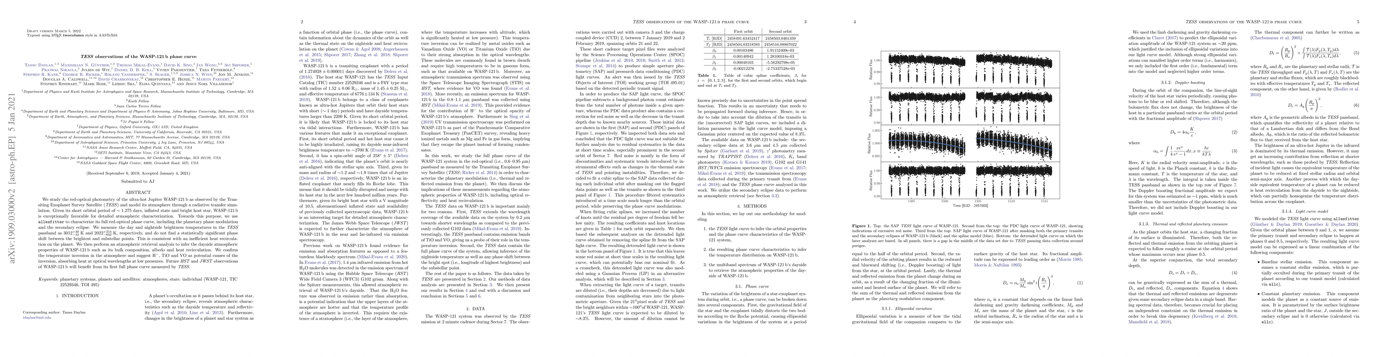 This study uses TESS observations to analyze the red-optical phase curve of the ultra-hot Jupiter WASP-121 b, revealing day and nightside brightness temperatures of 3012 K and 2022 K, respectively. The analysis suggests inefficient heat recirculation and identifies H$^-$, TiO, and VO as potential causes of the temperature inversion in the atmosphere.