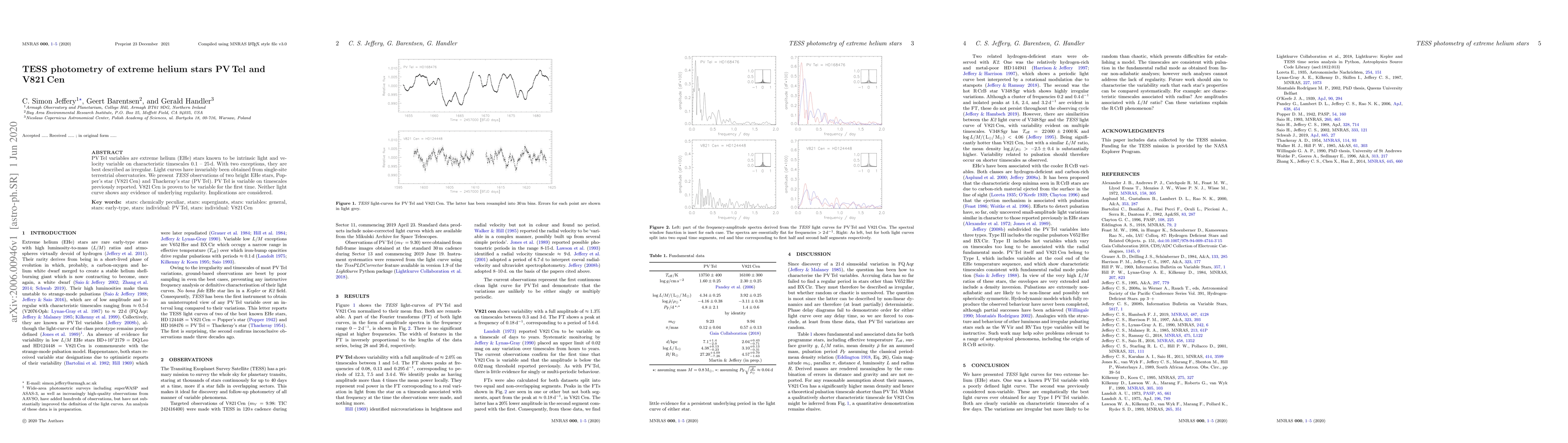 PV Tel variables are extreme helium (EHe) stars known to be intrinsic light and velocity variable on characteristic timescales 0.1 - 2 d. With two exceptions, they are best described as irregular. Light curves have invariably been obtained from single-site terrestrial observatories. We present TESS observations of two bright EHe stars, Popper's star (V821 Cen) and Thackeray's star (PV Tel). PV Tel is variable on timescales previously reported. V821 Cen is proven to be variable for the first time. Neither light curve shows any evidence of underlying regularity. Implications are considered.