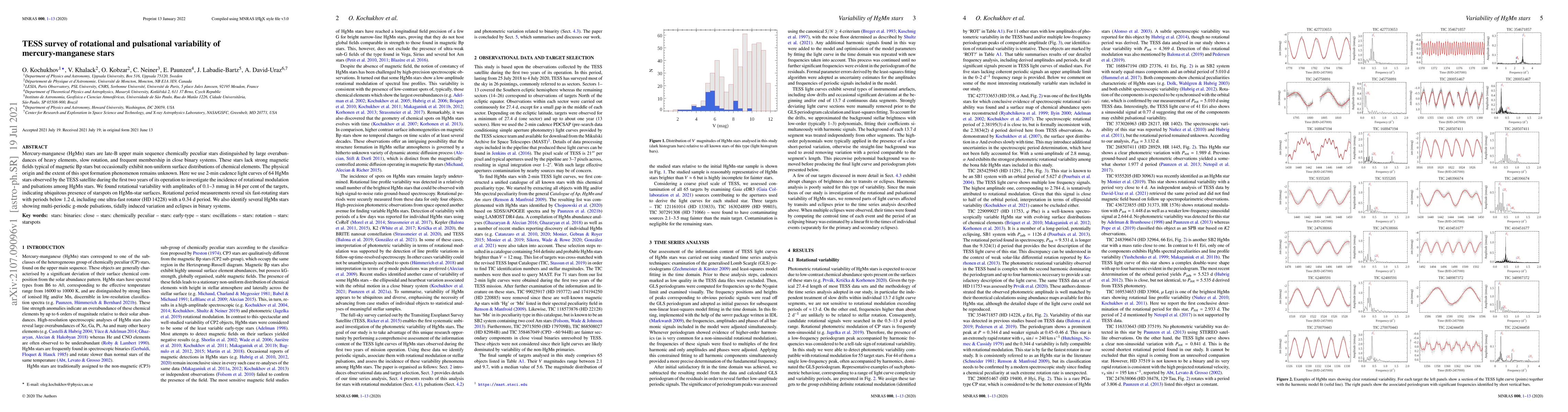 The TESS survey reveals that 84% of HgMn stars exhibit rotational variability, indicating widespread starspot presence, with some stars exhibiting ultra-fast rotation. Additionally, several stars show multi-periodic pulsations and variations due to tidal effects and binary eclipses.