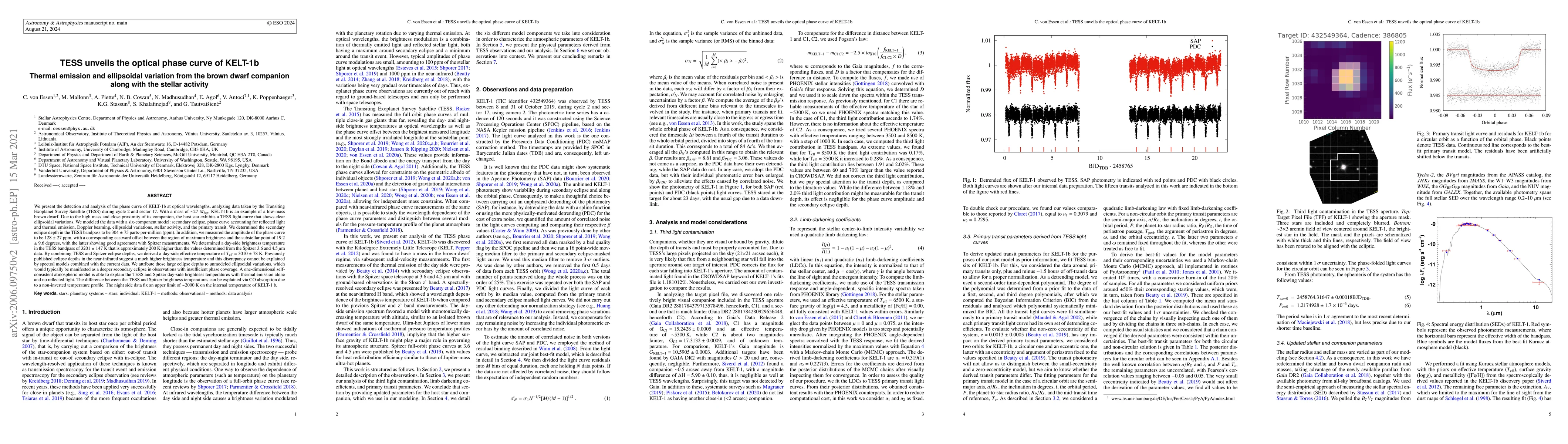 The TESS satellite has detected the optical phase curve of KELT-1b, revealing thermal emission and ellipsoidal variations due to its brown dwarf companion. The study models the data with a six-component model, determining accurate eclipse depth and phase curve amplitude, and explains the temperature differences between day and night sides with molecular opacity variations.