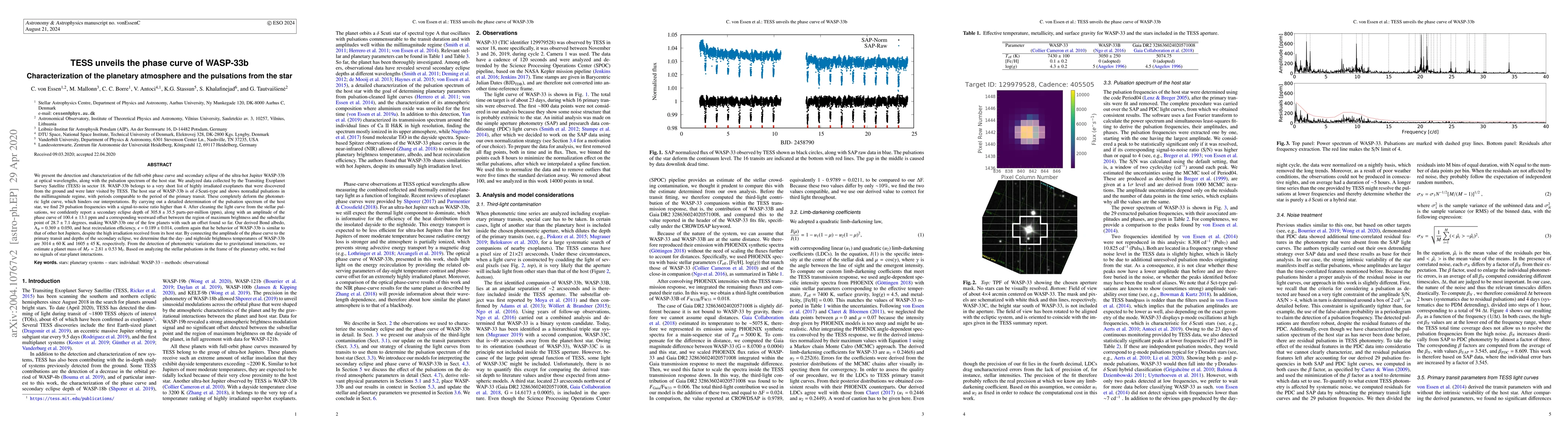 The TESS satellite has characterized the full-orbit phase curve and secondary eclipse of the ultra-hot Jupiter WASP-33b, revealing a secondary eclipse depth of 305.8 ppm and a phase curve amplitude of 100.4 ppm. The study also identified 29 pulsation frequencies in the host star, allowing for a cleaned light curve analysis.